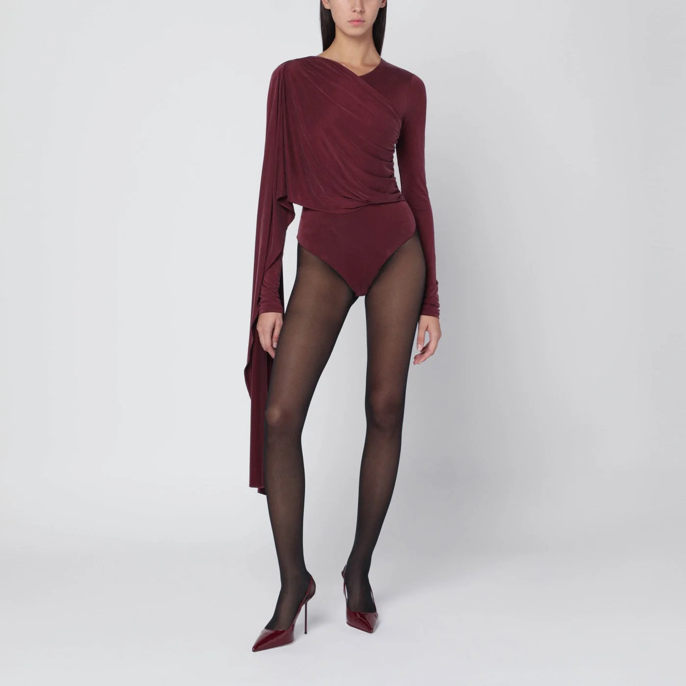 Round neck body by The Andamane in suede effect jersey colour red black characterized by a fitted fit long sleeves draped design buttons on the crotch and a long side cape.