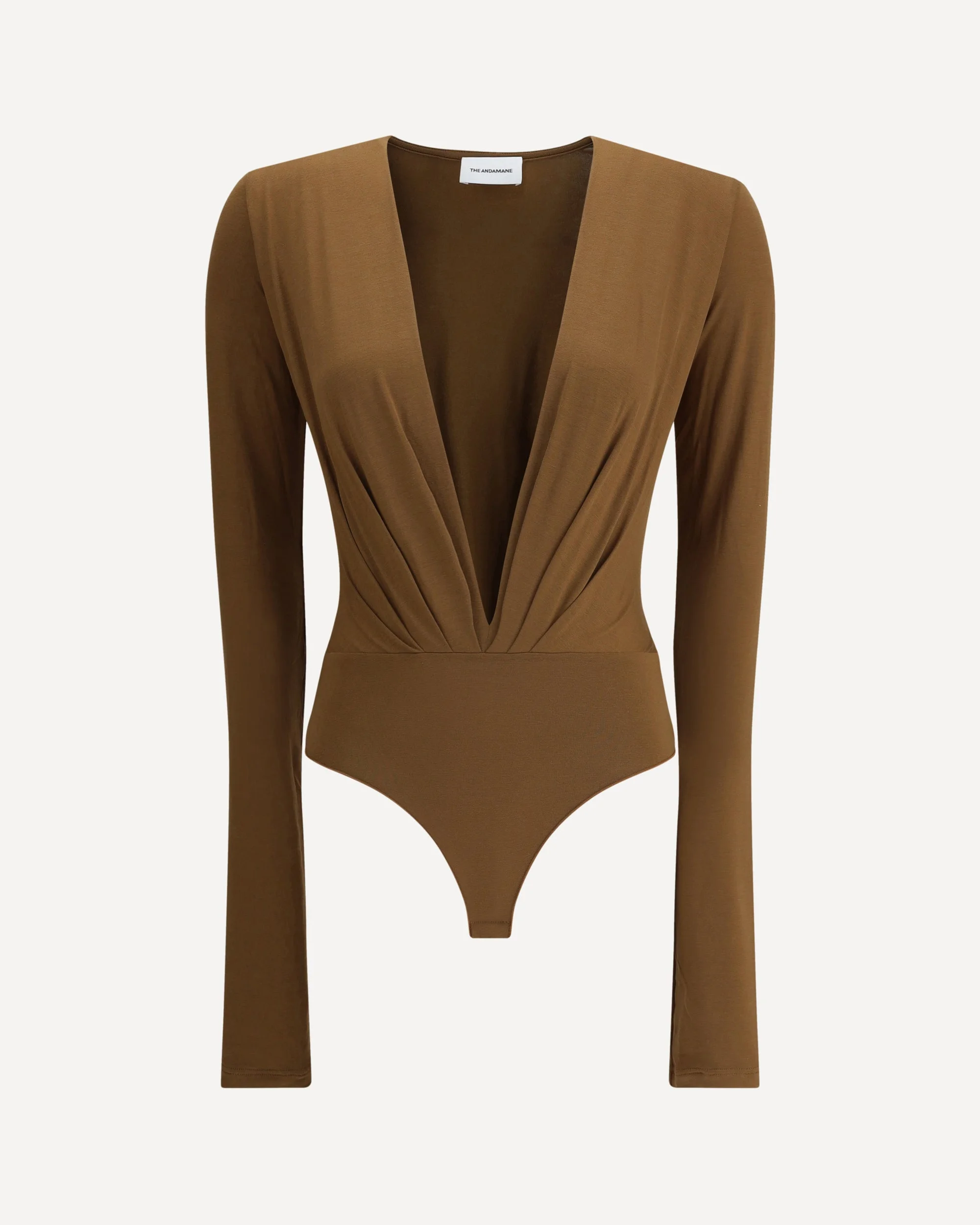 The Zelda bodysuit by The Andamane is an elegant and feminine piece featuring a draped V-neckline that enhances the silhouette. Long sleeves add a sophisticated touch, while the classic button-down bottom closure ensures convenience and comfort. DETAILS - Sku: T180771ATJV053_418 - Season: AW25 - Fit: Regular - Composition: GENERAL 95% Viscose 5% Elastane - MADE IN ITALY