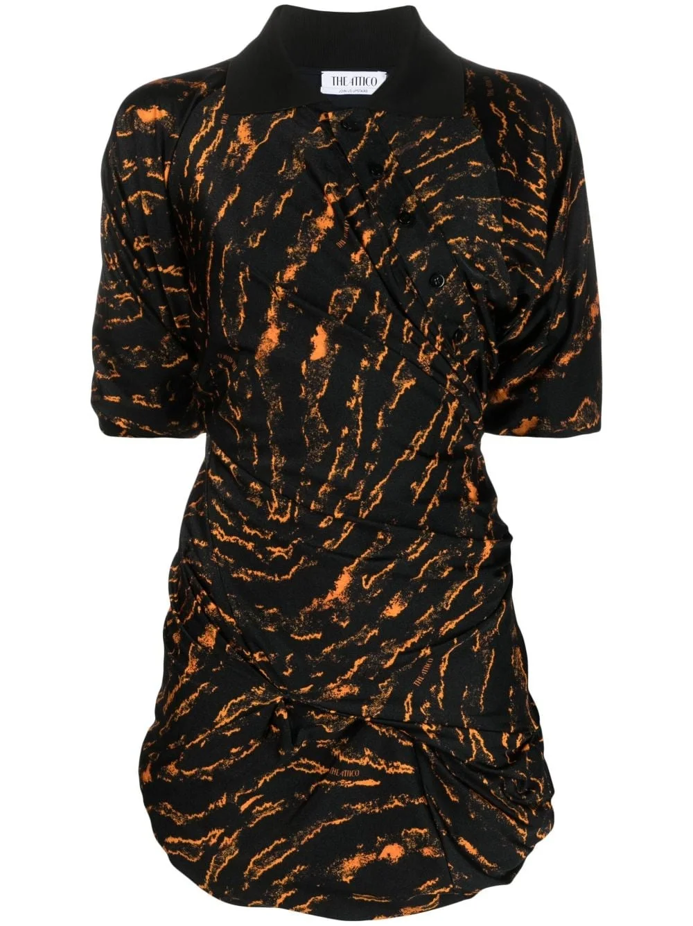 abstract-print gathered mini dress The Attico's opulent abstract prints are back for AW23. This a black and orange colourway, this mini dress is detailed with gathering at the skirt. It offers buttons at the front that are decoratively deviated to the side and can be opened up for a V-neckline. Highlights - Black/orange - Stretch-design - Abstract pattern print - Gathered detailing - Spread collar - V-neck - Front button fastening - Short sleeves - Thigh-length Made in Italy Composition Outer: Viscose 100%, Polyamide 80%, Elastane 20% Lining: Polyamide 73%, Elastane 27% SIZE & FIT Model measurements Height 5 ft 10 in(1.79 m) Bust/Chest 31.1 in(79 cm) Hips 35.03 in(89 cm) Waist 24.01 in(61 cm) FittingInformation Designed for a loose fit at the chest with a close fit over the waist and hips Slightly short in length; consider your own measurements Made from a midweight stretch fabric, this piece offers elasticity and flexibility when worn This piece fits true to size – take your usual size Washing instructions Machine Wash