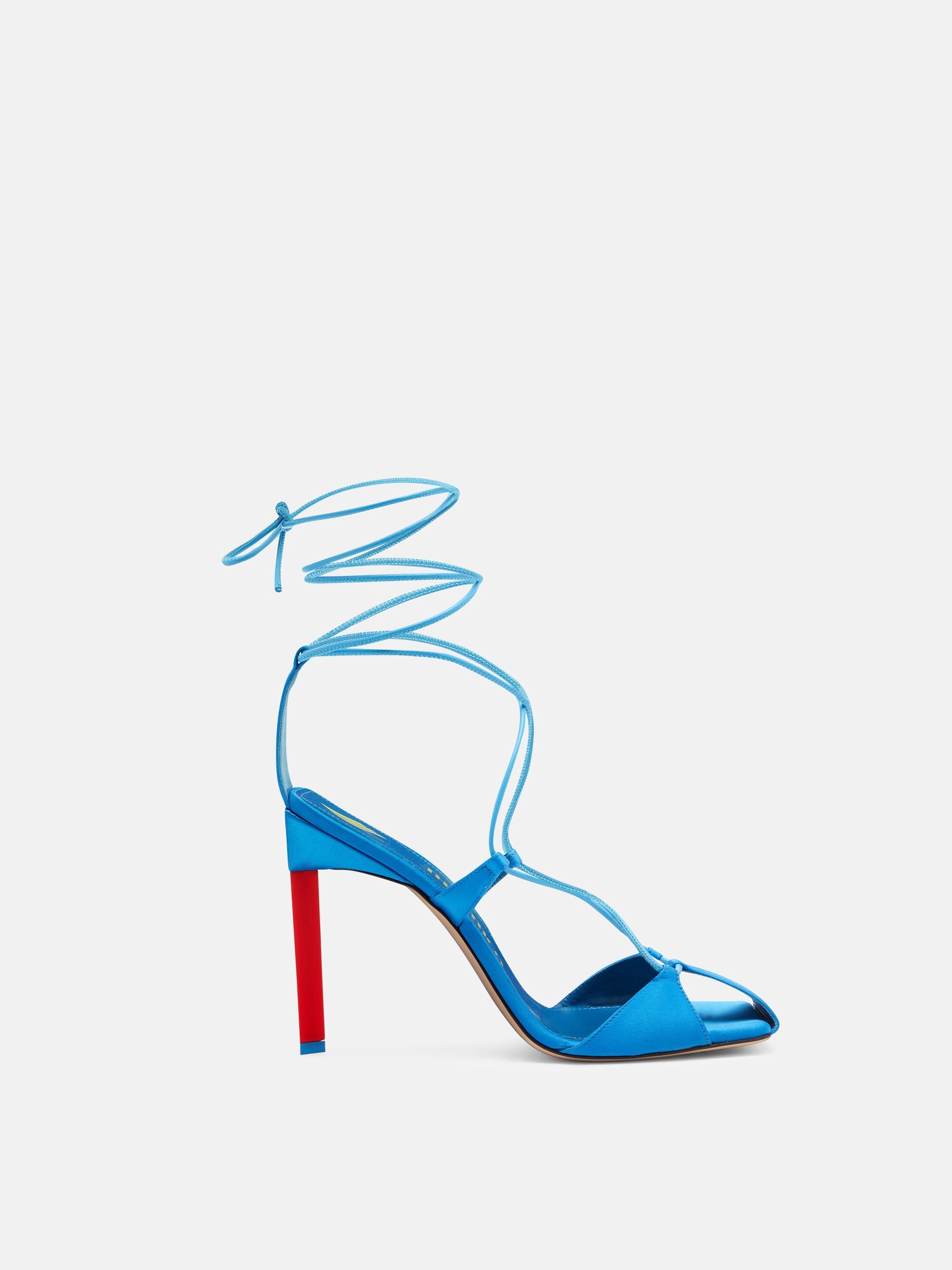 ''Adele'' lace-up sandal in turquoise satin, red lacquered heel and turquoise top piece, height 105mm. Style 232WS411V015469 SIZE & FIT The model is wearing a size 39. DETAILS Main fabric 90%: 100% polyester dyed, second leather 10%: 100% lamb leather dyed, ovis aries aries farm raised coo: South Africa, insole and lining: 100% goat leather dyed, capra hircus farm raised coo: India, sole: 100% bovine leather, dyed, bos taurus farm raised coo: Germany, heel 105mm - Style WS411V015469