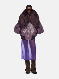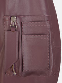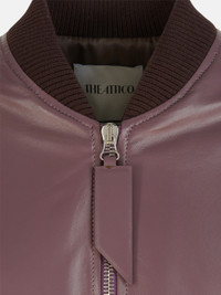 'Anja'' bomber in mauve leather with chocolate jacquard logo lining. Made in Romania. Style 241WCB04L054085 SIZE & FIT The model is wearing a size 40 and her height is 69,6 in, bust 31,4 in, waist 23,6 cm, hips 34,6 in - height 177 cm, bust 80 cm, waist 60 cm, hips 88 cm. Relaxed, oversized fit. We recommend taking one size smaller. DETAILS Main leather: 100% lamb leather (Ovis Aries Aries) dyed, farm raised, coo: Algeria, lining: 100% viscose, lining pockets: 100% cotton, padding: 100% polyester, second material: 44% wool 44% acetate 8% polyamide 4% elastane