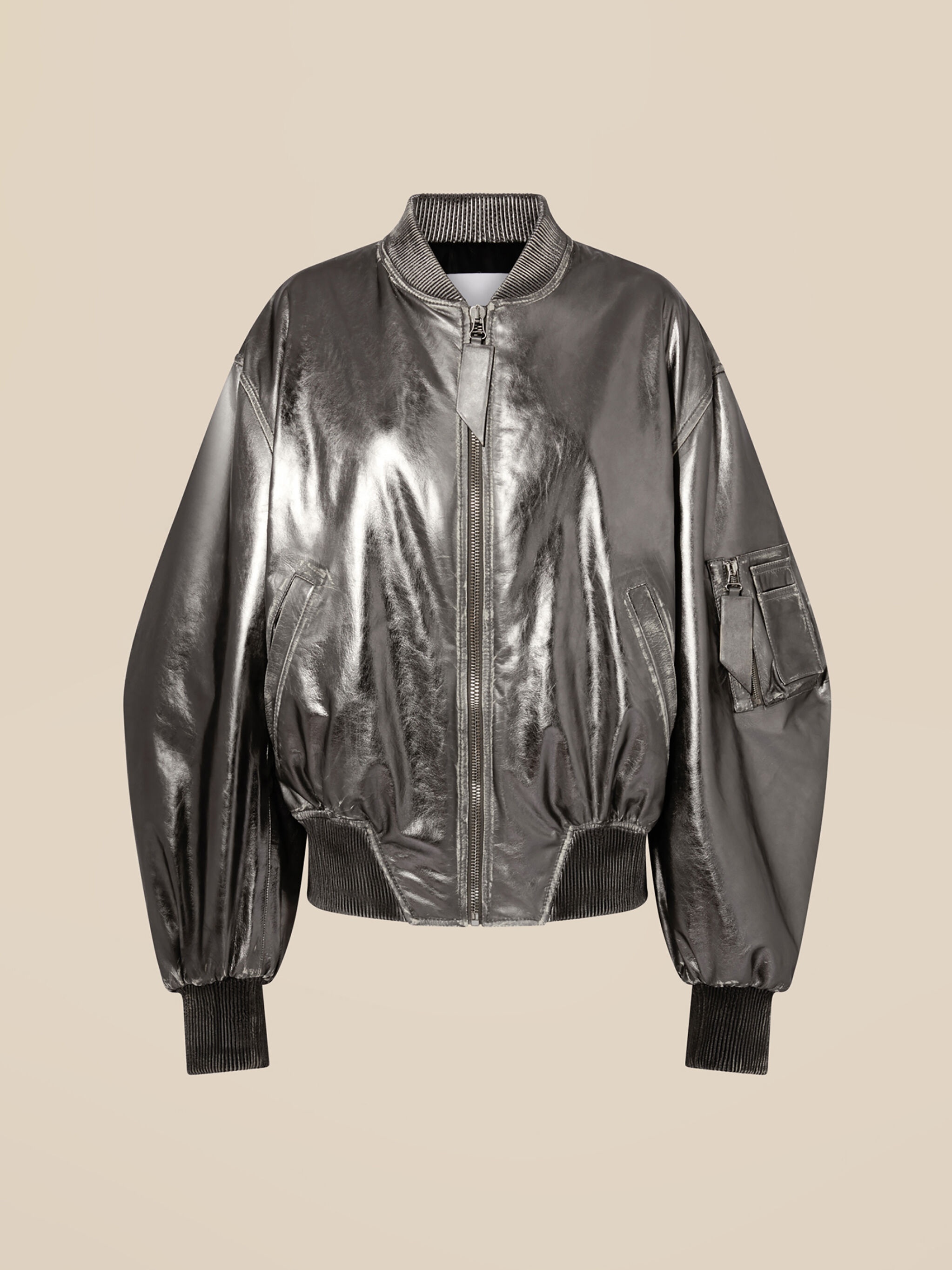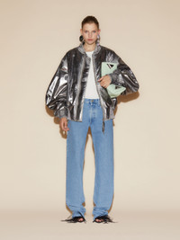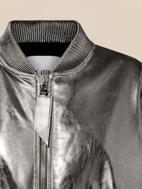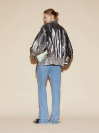 'Anja'' bomber in silver mirror leather destroyed with black jacquard logo lining. Made in Romania. Style 246WCB56L094D002 SIZE & FIT The model is wearing a size 40 and her height is 70,4 in, bust 29,9 in, waist 23,6 in, hips 33,8 in - height 179 cm, bust 76 cm, waist 55 cm, hips 86 cm.. Relaxed, oversized fit. We recommend taking one size smaller. DETAILS Main fabric: 100% leather, lining: 100% viscose, lining pockets: 100% cotton, padding: 100% cotton wool
