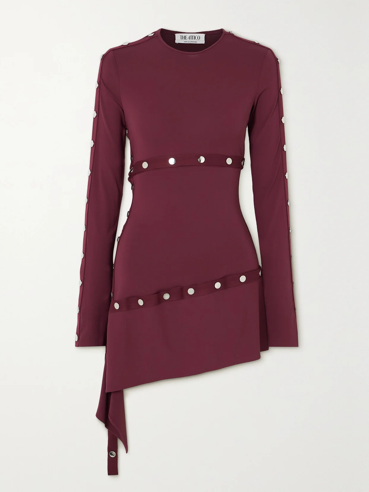 Look to The Attico for confident partywear that promises to stand out, like this purple mini dress. It's made from jersey with gold-tone studs that can be adjusted to create your own splits and cutouts along the grosgrain trim. Pull focus to the asymmetric hem with knee boots.