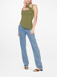 asymmetric sleeveless T-shirt from The Attico featuring olive green, stretch-design, halterneck, thin shoulder straps, scoop neck, scoop back and asymmetric hem. Size & Fit Model Measurements: Height: 1,78 m Bust/Chest: 82 cm Hips: 89 cm Waist: 59 cm Model wears size 40 Fabric and Care Designer Style ID: 227WCT127RY01 Designer Colour: 124 OLIVE Composition: Rayon 60%, Polyamide 31%, Spandex/elastane 9% Washing instructions: Hand Wash Made in Italy