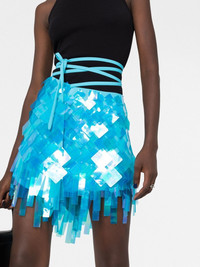 Aurelie embellished mini skirt turquoise blue-green disc detailing high waist tied waist asymmetric hem thigh-length Made in Italy Composition Polyester 100%, PVC 90%, glass 10% SIZE & FIT Model measurements Height 5 ft 11 in(1.8 m) Bust/Chest 32.67 in(83 cm) Hips 36.22 in(92 cm) Waist 24.4 in(62 cm) Measurement HIPS 32 in(81.3 cm) LENGTH 15.98 in(40.6 cm) WAIST 24.01 in(61 cm)