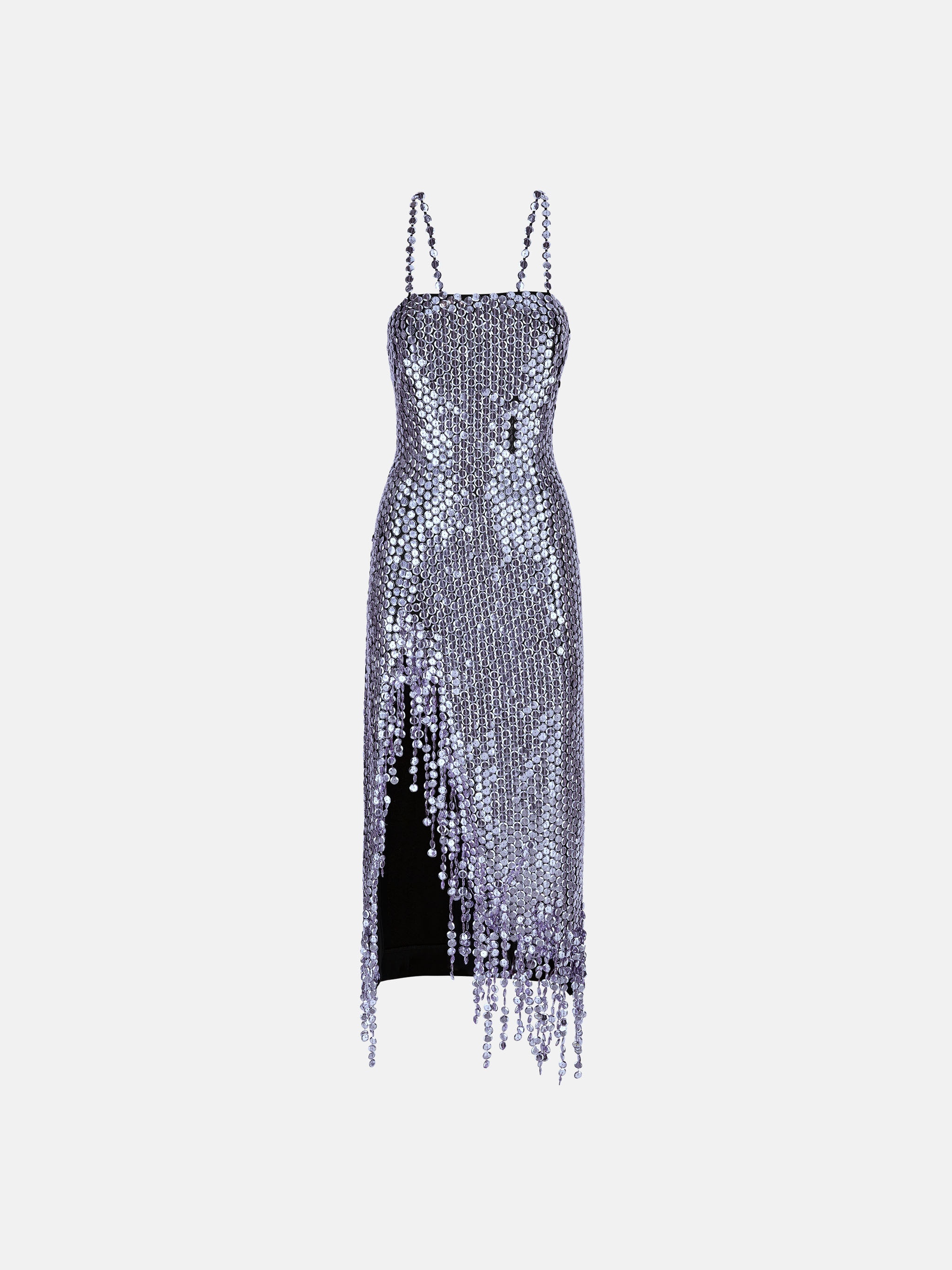 ''Avery'' midi dress in lavender hexagonal embroidered sequins with side split and logo metal triangle. Style 237WCW90H163287 SIZE & FIT Regular fit. We recommend taking your true size. DETAILS Main fabric: 92% PA, 8% EA - Fabric 2: 68% RY, 27% PA, 5% EA - Lining: 92% PA, 8% EA - Embroidery: 100% PVC
