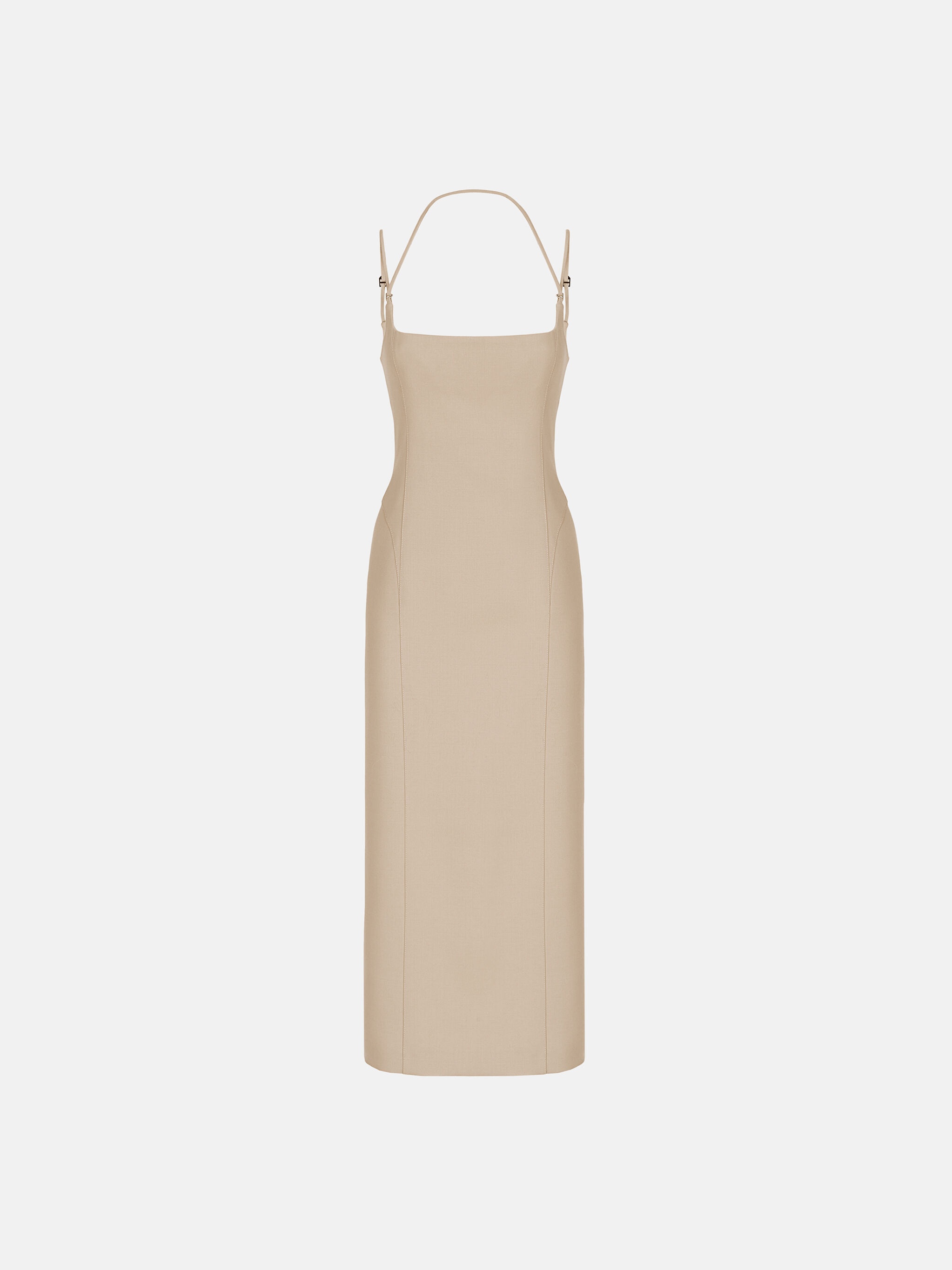 Midi dress in beige gabardine with double strap and logo metal adjusters. Made in Italy. Style 241WCM106W046198 SIZE & FIT The model is wearing a size 40 and her height is 69,6 in, bust 31,4 in, waist 23,6 cm, hips 34,6 in - height 177 cm, bust 80 cm, waist 60 cm, hips 88 cm. Regular fit. We recommend taking your true size. DETAILS Main fabric: 100% virgin wool, lining: 53% acrylic 47% viscose