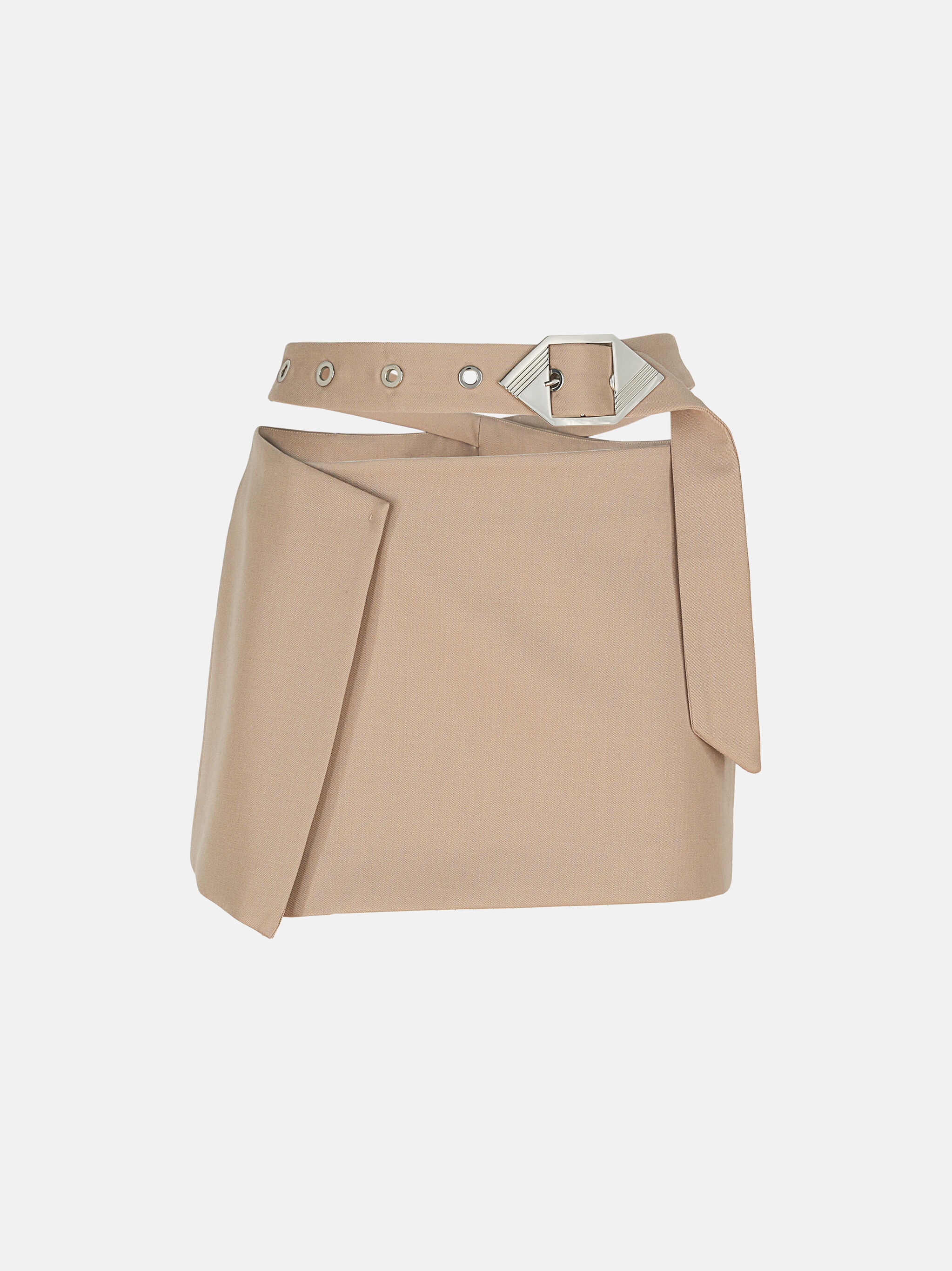 Wrapped mini skirt in beige gabardine with cross on the back, belt and logo metal buckle. Made in Italy. Style 241WCS182W046198 SIZE & FIT The model is wearing a size 40 and her height is 69,6 in, bust 31,4 in, waist 23,6 cm, hips 34,6 in - height 177 cm, bust 80 cm, waist 60 cm, hips 88 cm. Regular fit. We recommend taking your true size. DETAILS Main fabric: 100% virgin wool, lining: 53% acetate 47% viscose