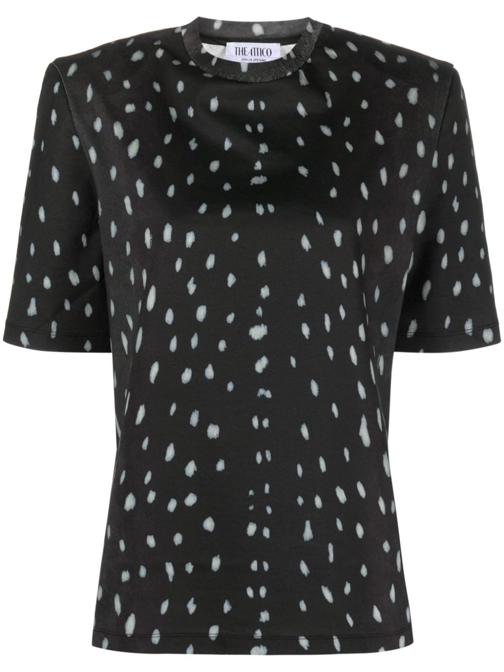 Bella abstract-print cotton T-shirt Elevating a minimalist silhouette, this top from The Attico is enlivened with an all-over dotted print, reflecting the Italian labelâs propensity for eye-catching design. Highlights - Chocolate brown - Cotton - Jersey texture - Faded effect - Abstract print - Logo print at the chest - Ribbed crew neck - Shoulder pads - Short sleeves - Straight hem Imported Composition Cotton 100% SIZE & FIT Model measurements Height 5 ft 11 in(1.8 m) Bust/Chest 31.5 in(80 cm) Hips 35 in(89 cm) Waist 24.4 in(62 cm) FittingInformation Designed for a relaxed fit, this piece allows for comfort and movement when worn The internal shoulder pads offer a structured shape Made from a midweight non-stretch fabric, this piece offers minimal elasticity when worn This piece fits true to size – take your usual size