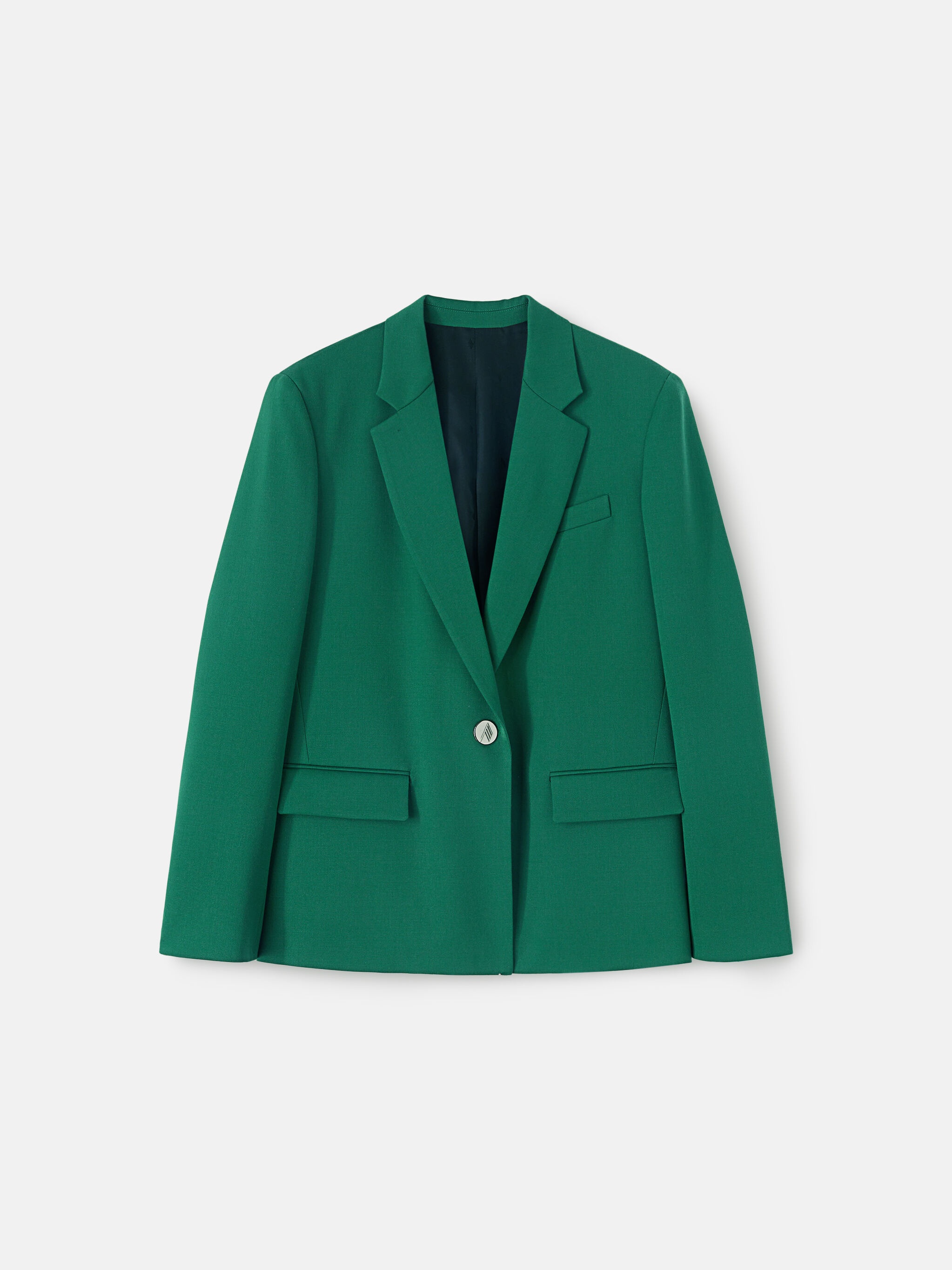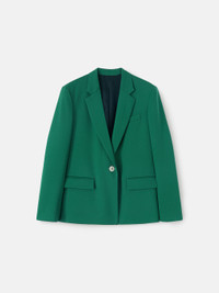 'Bianca'' masculine blazer in emerald cool wool with black jacquard logo lining and black glazed logo button. Made in Italy. Style 236WCG25W041028 SIZE & FIT The model is wearing a size 40 and her height is 70,4 in, bust 30,7 in, waist 21,6 in, hips 34,6 in - height 179 cm, bust 80 cm, waist 60 cm, hips 90 cm. Relaxed, oversized fit. We recommend taking one size smaller. DETAILS Main fabric: 98% virgin wool 2% elastane, lining: 100% cupro