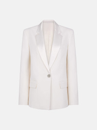 ''Bianca'' masculine blazer in milk stretch wool gabardine and duchesse details with white jacquard logo lining and logo metal button. Style 232WCG25W041D043 SIZE & FIT The model is wearing a size 40 and her height is 179 cm, bust 80 cm, waist 60 cm, hips 90 cm. Relaxed, oversized fit. We recommend taking one size smaller. DETAILS Main fabric: 98% virgin wool, 2% elastane, second fabric: 100% silk, lining: 100% cupro