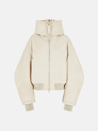 Bomber in ivory leather with hoodie and metal ends in black leather. Made in Italy. Style 250WCB00062LBT128AA507 SIZE & FIT The model is wearing a size 40 and her height is 69,6 in, bust 30,7 in, waist 23,2 in, hips 34,6 in - height 177 cm, bust 78 cm, waist 59 cm, hips 88 cm. Regular fit. We recommend taking your true size. DETAILS Main Material: 100% Lamb Leather, Ovis Aries Aries, farm raised,coo: Tunisia , Lining: 100% VI, Pockets lining: 100% CO , Padding:100% PL, Rib: 45% CO 45% PC 6% PA 4% EA