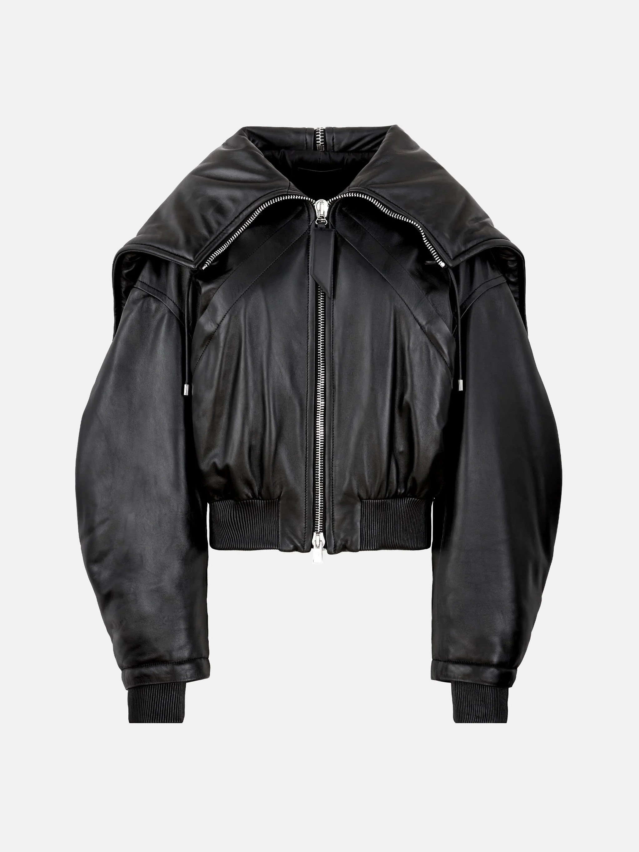Bomber in black leather with hoodie and metal ends. Made in Romania. Style 247WCB62L054100 SIZE & FIT The model is wearing a size 40 and her height is 69,6 in, bust 30,7 in, waist 23,2 in, hips 34,6 in - height 177 cm, bust 78 cm, waist 59 cm, hips 88 cm. Regular fit. We recommend taking your true size. DETAILS Main leather: 100% lamb leather (ovis aries aries), dyed, farm raised, coo: Tunisia, lining: 100% viscose, lining pocket: 100% cotton, padding: 100% polyamide