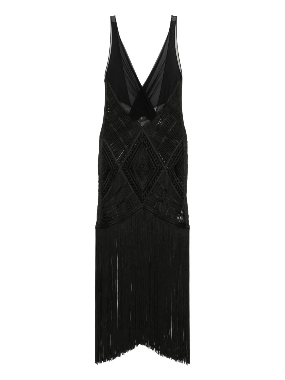 fringed midi dress Highlights - Black - V-neck - Fringed hem - Sleeveless - Criss-cross back Imported Composition Viscose 100%, Polyamide 100% SIZE & FIT Model measurements Height 5 ft 9 in(1.76 m) Bust/Chest 31.49 in(80 cm) Hips 35.43 in(90 cm) Waist 23.62 in(60 cm) Washing instructions Read Manufacturer Guidelines