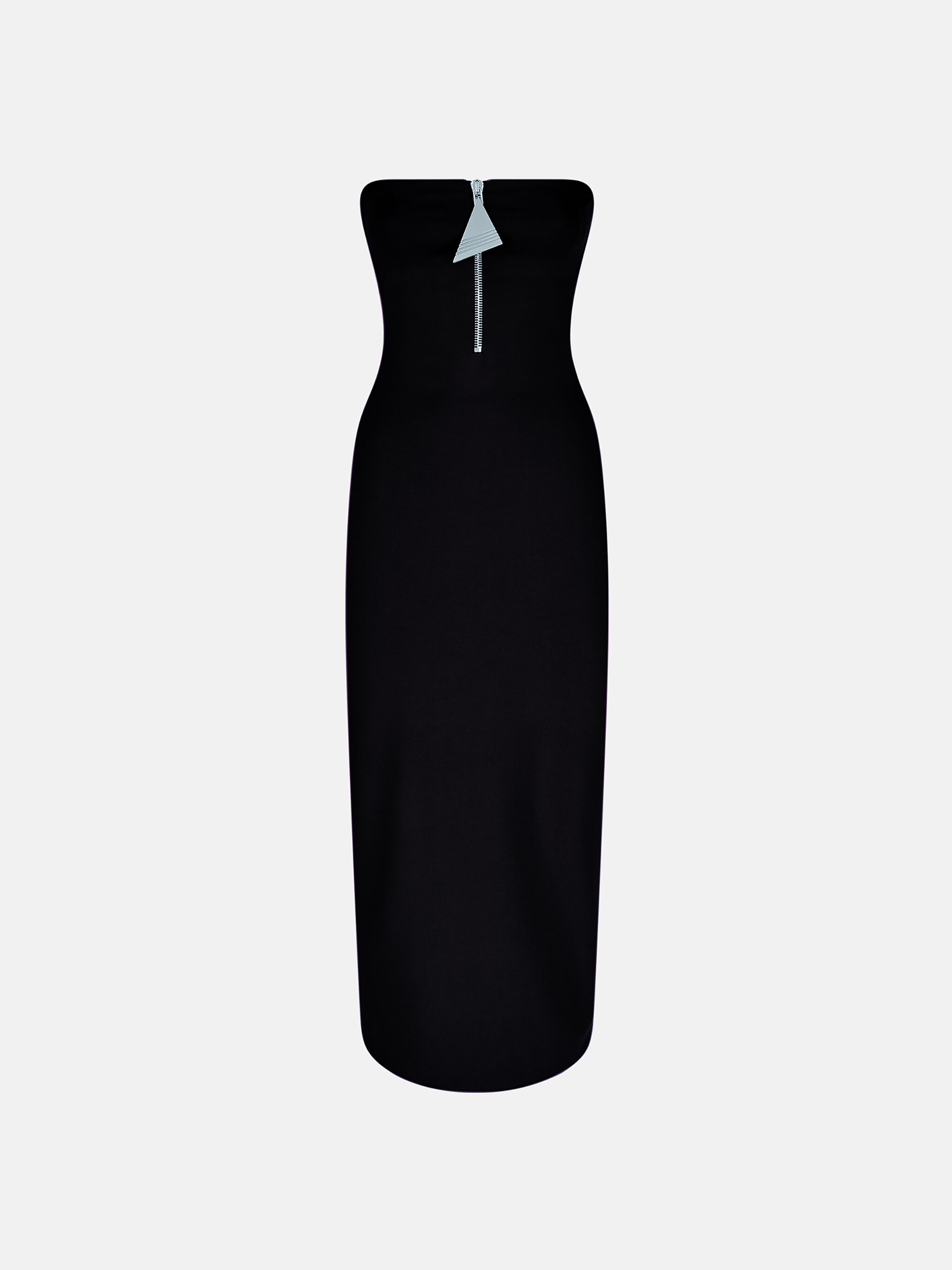 Midi strapless dress in black compact techno jersey with bustier and metal zip. Made in Italy. Style 247WCM176RY02100 SIZE & FIT The model is wearing a size 40 and her height is 69,6 in, bust 30,7 in, waist 23,2 in, hips 34,6 in - height 177 cm, bust 78 cm, waist 59 cm, hips 88 cm. Regular fit. We recommend taking your true size. DETAILS Main material: 68% viscose 27% polyamide 5% elastane, second material: 85% polyamide 15% elastane
