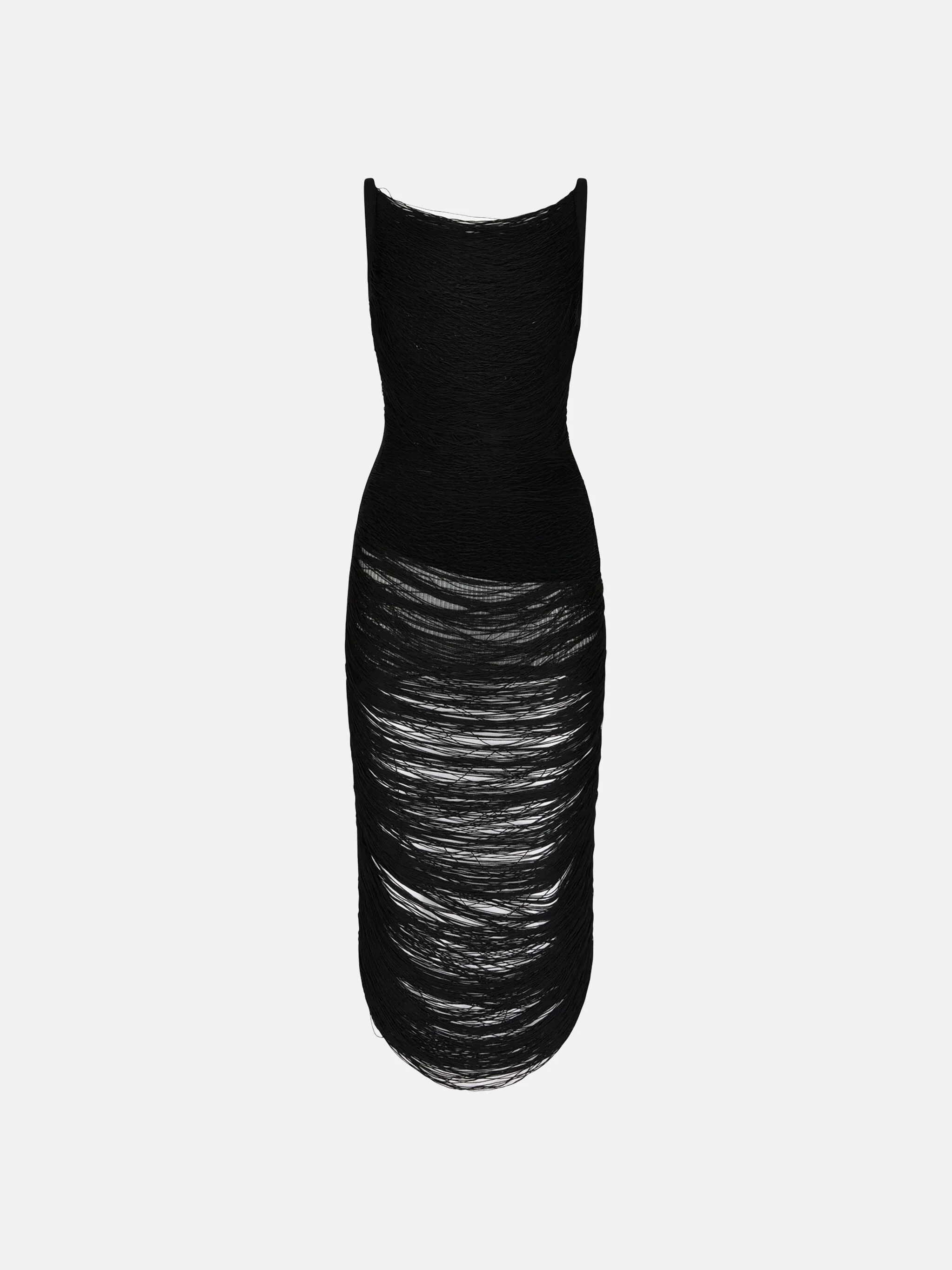 Midi dress in black knitted viscose fringes. Made in Italy. Style 250WCW00239KVV015AA100 SIZE & FIT The model is wearing a size 40 and her height is 5,10 in, bust 33,5 in, waist 24 in, hips 34,5 in - height 179 cm, bust 85 cm, waist 61 cm, hips 88 cm. Regular fit. We recommend taking your true size. DETAILS Main material: 83% viscose 17% polyamide, lining: 82% cotton 18% polyamide