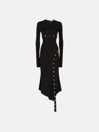 Midi dress in black stretch jersey with long sleeves, asymmetrical bottom, trim with logo metal snaps and logo metal terminals. Made in Italy. Style 241WCM99A014100 SIZE & FIT The model is wearing a size 40 and her height is 69,6 in, bust 31,4 in, waist 23,6 cm, hips 34,6 in - height 177 cm, bust 80 cm, waist 60 cm, hips 88 cm. Regular fit. We recommend taking your true size. DETAILS Main fabric: 75% acetate 20% polyamide 5% other fibres, butto tape: 80% pressure tape (99% cotton 1% polyester), buttons: 12% zama 8% brass