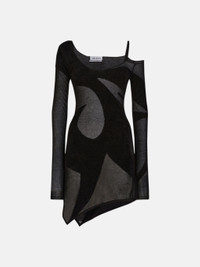 Sleeveless long dress in black chiffon viscose with macro tribal tattoo design, asymmetrical cut, wide neckline, one bare shoulder and side slits. Made in Italy. Style 241WCA284KC067100 SIZE & FIT The model is wearing a size 40 and her height is 69,6 in, bust 31,4 in, waist 23,6 cm, hips 34,6 in - height 177 cm, bust 80 cm, waist 60 cm, hips 88 cm. Regular fit. We recommend taking your true size. DETAILS Main fabric: 38% cotton 34% polyamide 28% viscose