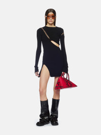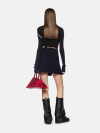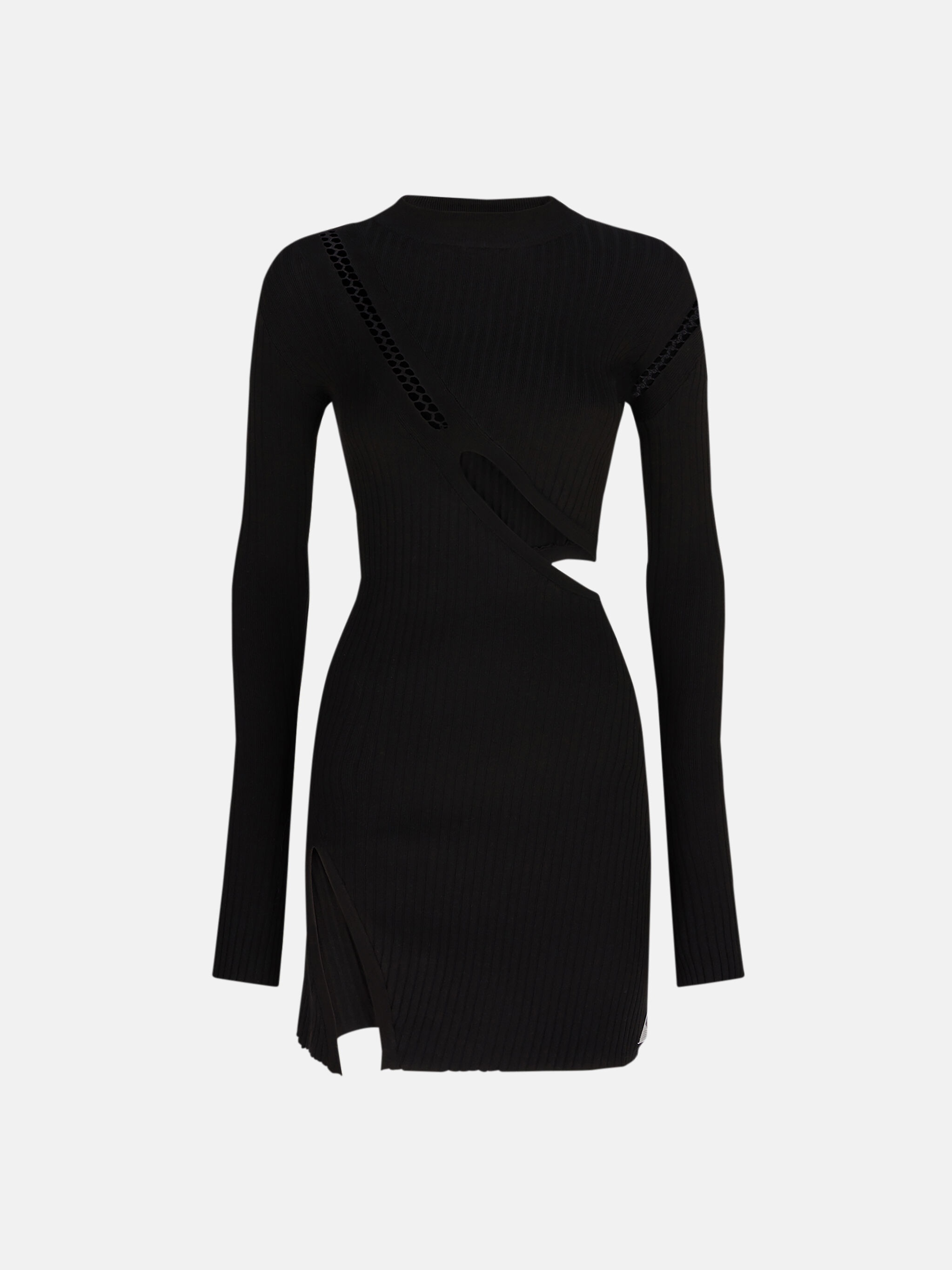 Mini dress in black stretch viscose with oblique cuts and embroidered logo label. Made in Italy. Style 242WCA283KV001100 SIZE & FIT The model is wearing a size 40 and her height is 69,6 in, bust 31,4 in, waist 23,6 cm, hips 34,6 in - height 177 cm, bust 80 cm, waist 60 cm, hips 88 cm. Fitted style. We recommend taking one size larger. DETAILS Main fabric: 69% Viscose 29% polyester 2% cotton