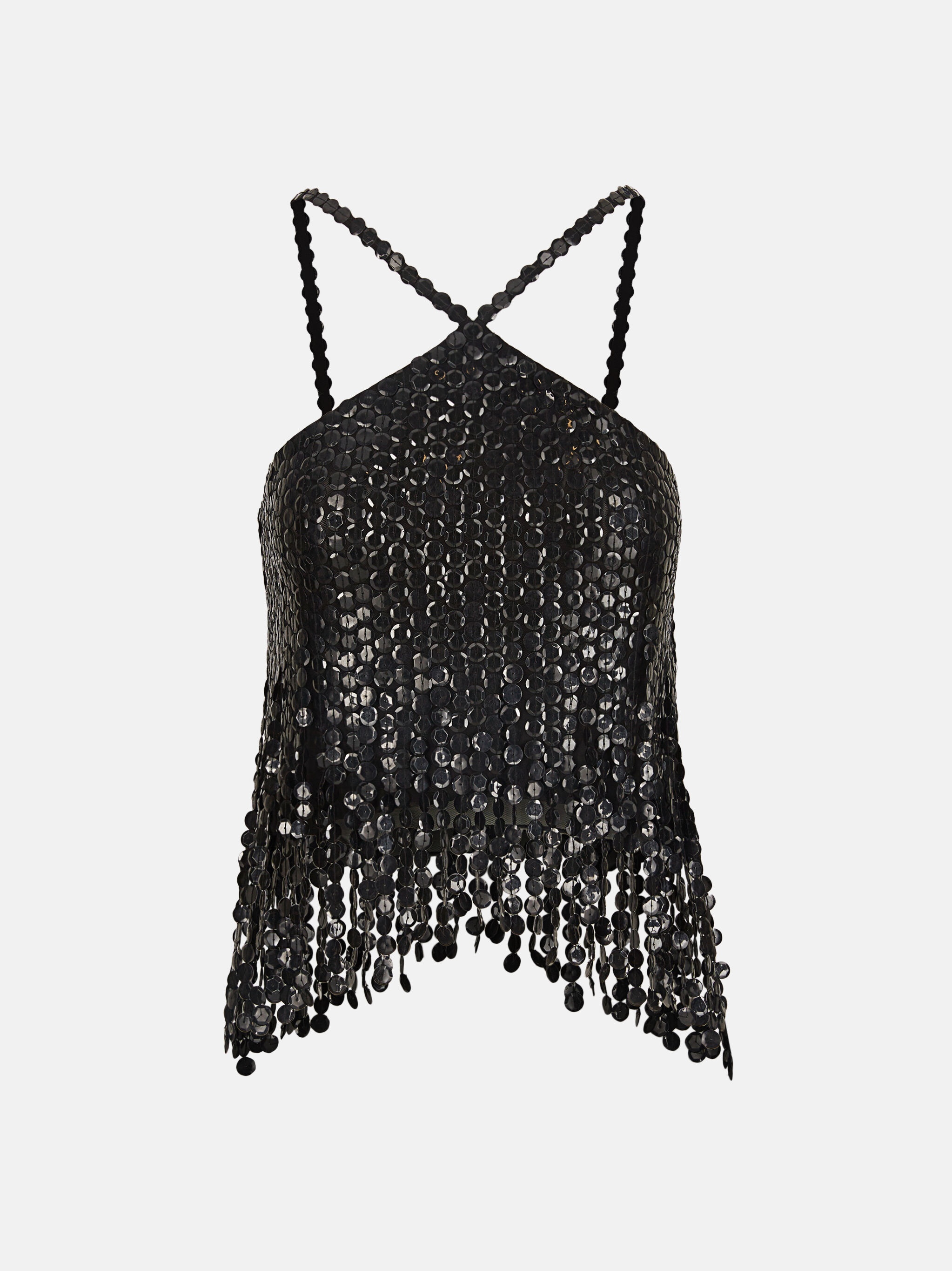 Top in black hexagonal embroidered sequins with halter neckline and logo metal ring. Style 237WCT217H163100 SIZE & FIT Regular fit. We recommend taking your true size. DETAILS Main fabric: 92% PA, 8% EA - Lining: 92% PA, 8% EA - Embroidery: 100%PVC