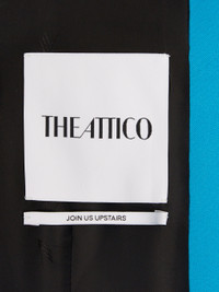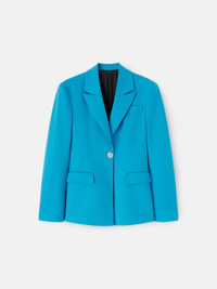 ''Blue'' hourglass blazer in capri blue cool wool with black jacquard logo lining and logo metal button. Style 237WCG26W041258 SIZE & FIT Fitted style. We recommend taking one size larger. DETAILS Main fabric: 98% virgin wool 2% elastane, lining: 100% cupro