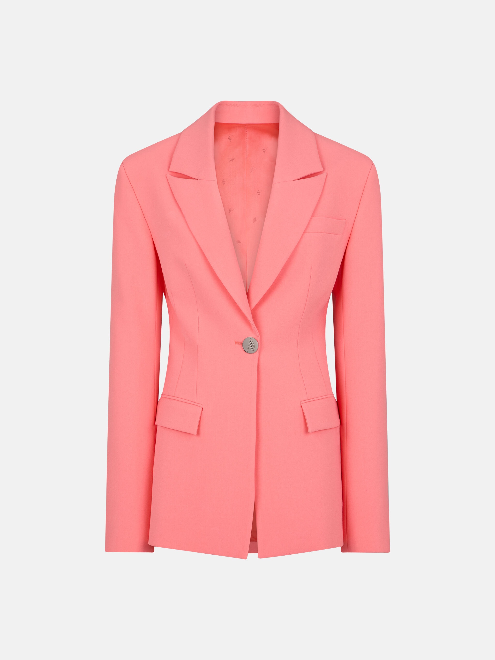 ''Blue'' hourglass blazer in salmon tailored viscose with peach jacquard logo lining and logo metal button. Style 232WCG26E057087 SIZE & FIT The model is wearing a size 40 and her height is 179 cm, bust 80 cm, waist 60 cm, hips 90 cm. Fitted style. We recommend taking one size larger. DETAILS Main Fabric: 68% polyamid 29% viscose 3% elastane, lining 100% cupro