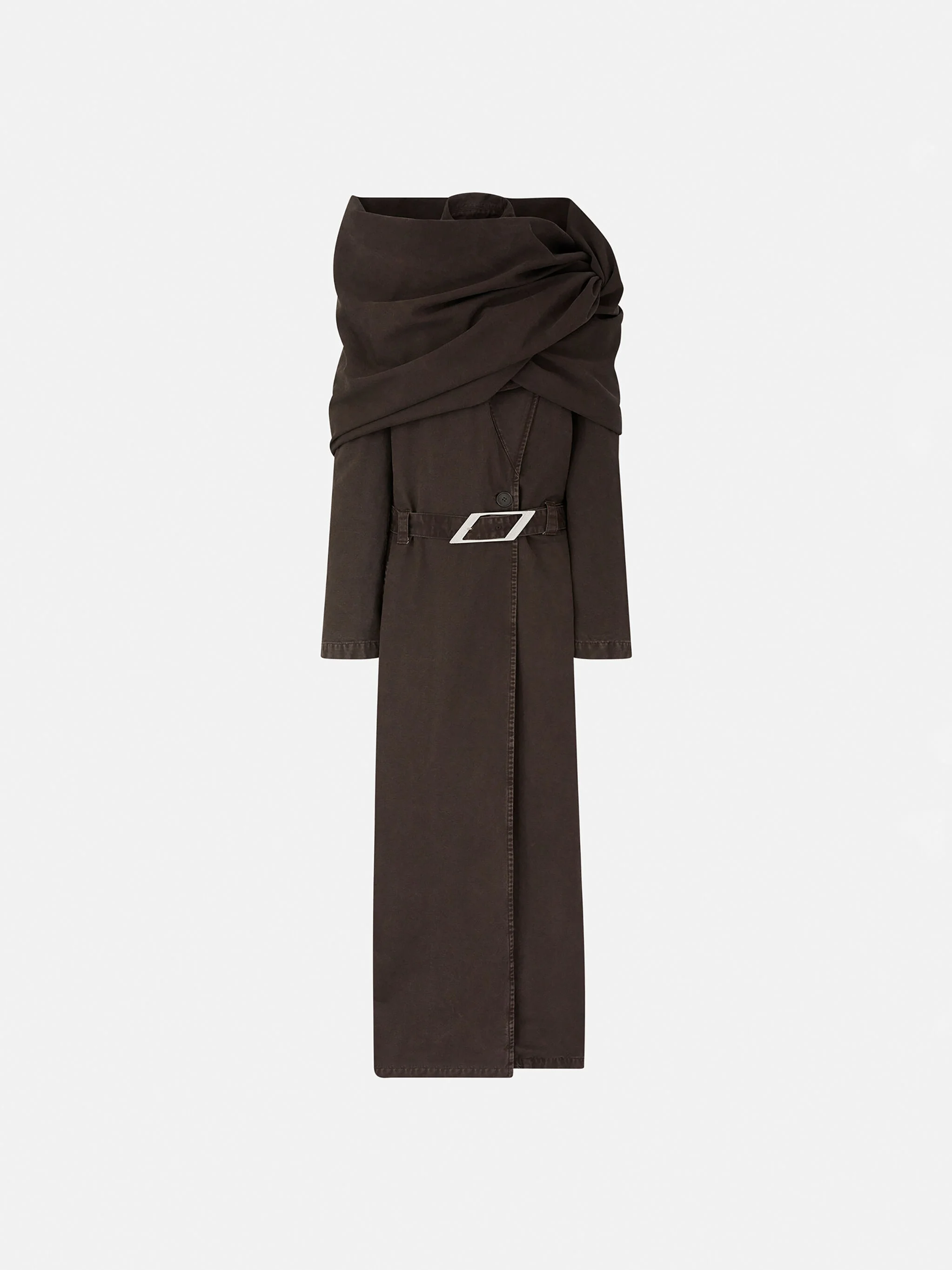 Oversize long coat in brown tailoring, with shawl and belt with buckle logo. Made in Italy. Style SPEWCC62C093064 SIZE & FIT The model is wearing a size 40 and her height is 5,10 in, bust 33 in, waist 24 in, hips 91,4 in - height 177 cm, bust 83 cm, waist 60,9 cm, hips 91,4 cm. Regular fit. We recommend taking your true size. DETAILS Main material: 100% cotton, lining: 100%cotton, lining 2: 100% polyester