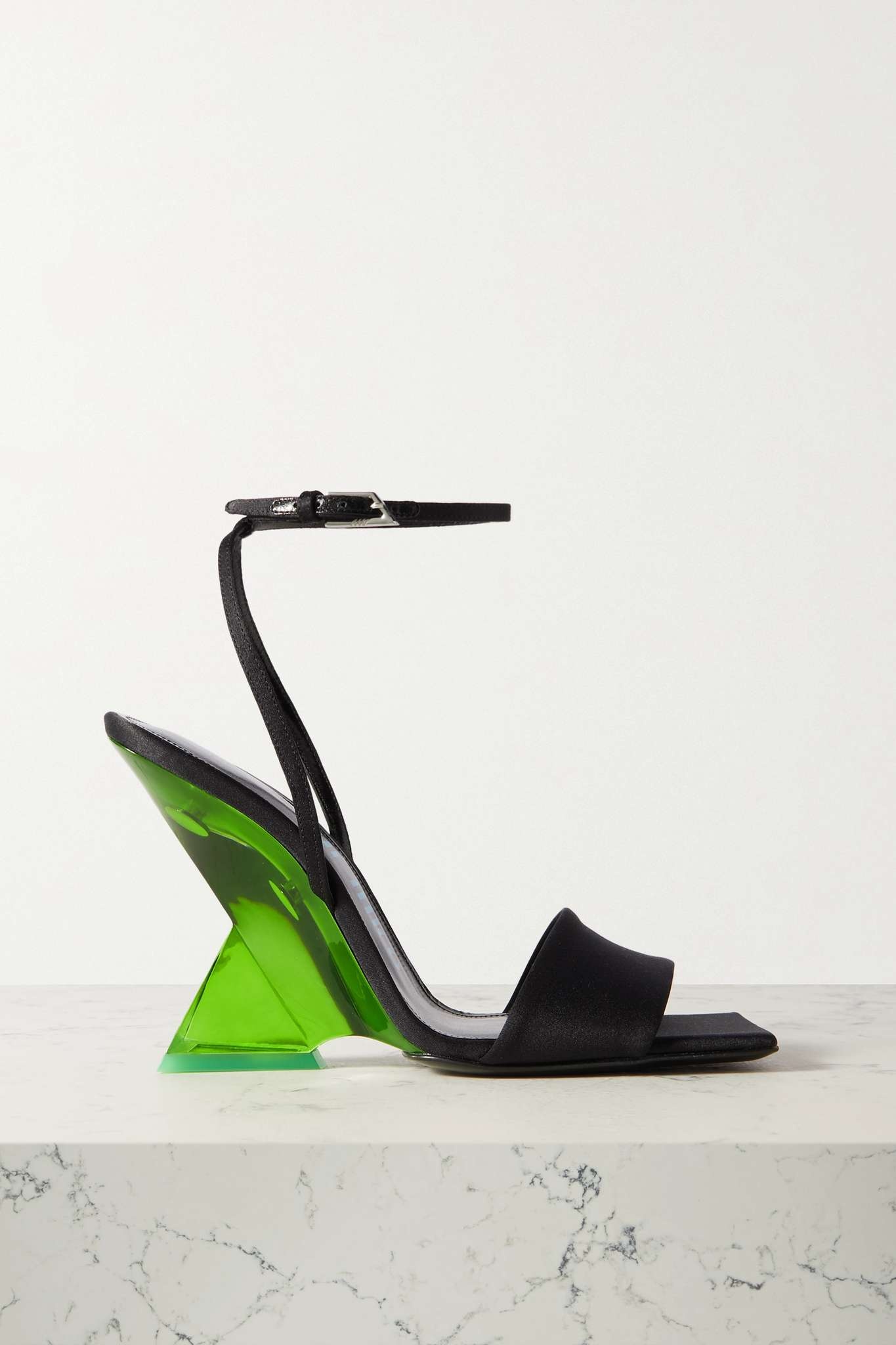 EDITORS'NOTES Each of The Attico's pieces makes an impact - these 'Cheope' sandals will always look powerful, whether worn with minimal tailoring or one of the label's sequined mini dresses. Crafted in Italy from satin, they have a slender ankle strap and sculptural acrylic wedge that adds four inches to your frame. SIZE & FIT - Fits true to size, take your normal size - Italian sizing DETAILS & CARE - Heel measures approximately 105mm/ 4 inches - Black satin, black leather (Goat) - Buckle-fastening ankle strap