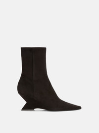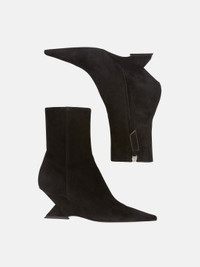 'Cheope'' ankle boot in black suede with pyramidal wedge, height 60mm. Made in Italy. Style 236WS712L007100 SIZE & FIT Model wears size 39. DETAILS Main Leather: 100% lamb leather dyed, ovis aries aries farm raised coo: South Africa, insole and lining: 100% goat leather dyed, capra hircus farm raised coo: India, sole: 100% bovine leather dyed, bos taurus farm raised coo: Germany, heel 60mm.