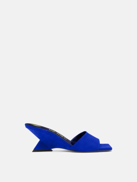 ''Cheope'' mule in cobalt blue suede with pyramidal wedge, height 60mm. Style 232WS605L007441 SIZE & FIT The model is wearing a size 39. DETAILS Main leather: 100% goat leather dyed, capra hircus farm raised coo: Spain, insole and lining: 100% goat leather dyed, capra hircus farm raised coo: India, sole: 100% bovine leather dyed, bos taurus farm raised coo: France-Heel 60mm-Style WS605L007441