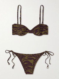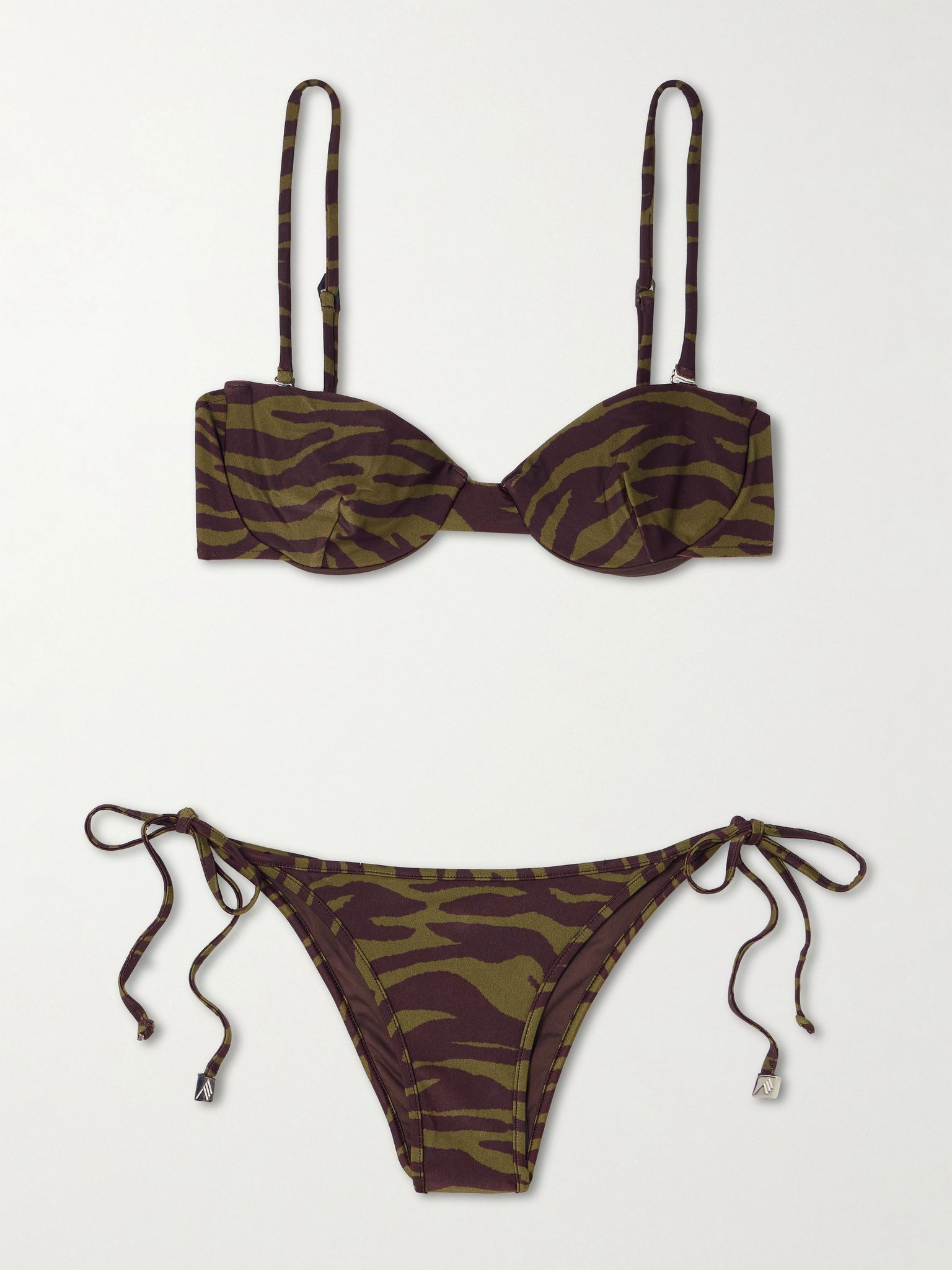The Attico's bikini is printed with zebra stripes in neutral shades of army-green and brown. It has underwired cups and detachable straps, as well as adjustable side ties so you can perfect the fit. Wear yours with the matching pareo from our edit. Size & Fit - Fits true to size, take your normal size - Underwired style - Fully adjustable, detachable shoulder straps - Low-rise briefs with medium coverage - Model is 175cm/ 5'9", bra size 32A and is wearing a size XSmall Model measurements: - Bust: 81cm/ 32" - Waist: 68cm/ 27" - Hip: 91cm/ 36" Details & Care - Army-green and brown stretch-polyamide - Clasp fastening at back, briefs ties at sides - 80% polyamide, 20% elastane; lining: 84% polyester, 16% elastane - Hand wash - Lotion, sunscreen, oil and chlorine can cause discoloration of this item; this is not a manufacturing defect. Please follow care instructions to keep your swimwear in the best condition