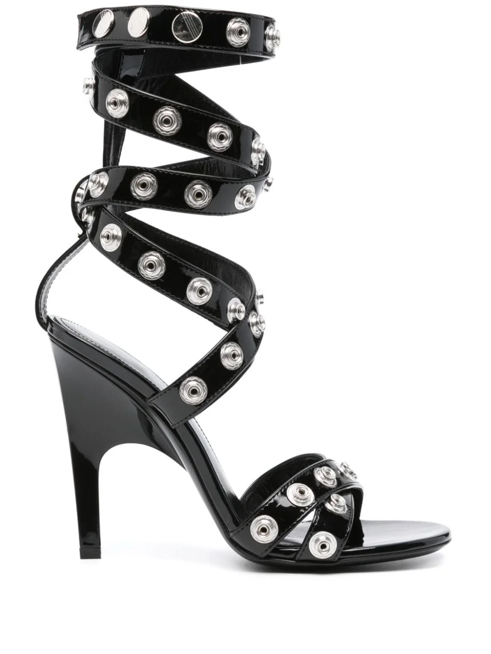 Cosmic 110mm sandals The Attico's play with shapes punctuates these Cosmic sandals. Made from smooth leather in Italy, they're defined by their decorative press-stud detailing. Highlights - Black - Faux leather - Patent finish - Decorative press-stud detailing - Round open toe - Crossover strap at the toe - Multi-way straps at the ankle - Branded leather insole - 110mm high sculpted heel - Leather outsole - Spare press studs - Silver-tone hardware - Press-stud fastening - This piece comes complete with a protective dust bag. Made in Italy Composition Outer: Polyurethane 100% Lining: Polyurethane 100%, Calf Leather 100% Sole: Calf Leather 100% SIZE & FIT Measurement CIRCUMFERENCE 8.85 in(22.5 cm) HEEL 4.33 in(11 cm) HEIGHT 5.9 in(15 cm)