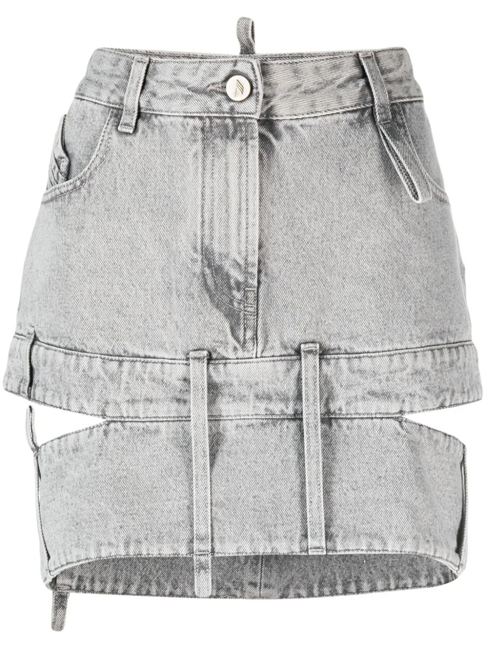 EDITORS'NOTES Denim is everywhere this season but The Attico keeps things fresh with this deconstructed mini skirt. It's cutout above the hem and embroidered with a logo at the back pocket. Pair it with knee boots to lead the eye towards the slashed panel. SIZE & FIT - Fits true to size, take your normal size - Mini-length, designed to be worn at the hip - Particularly short length - Mid-weight, non-stretchy fabric - Model is 180cm/ 5’11” and is wearing a size 26 DETAILS & CARE - Light-gray denim - Button and concealed zip fastening at front - 100% cotton; lining: 65% polyester, 35% cotton - Hand wash