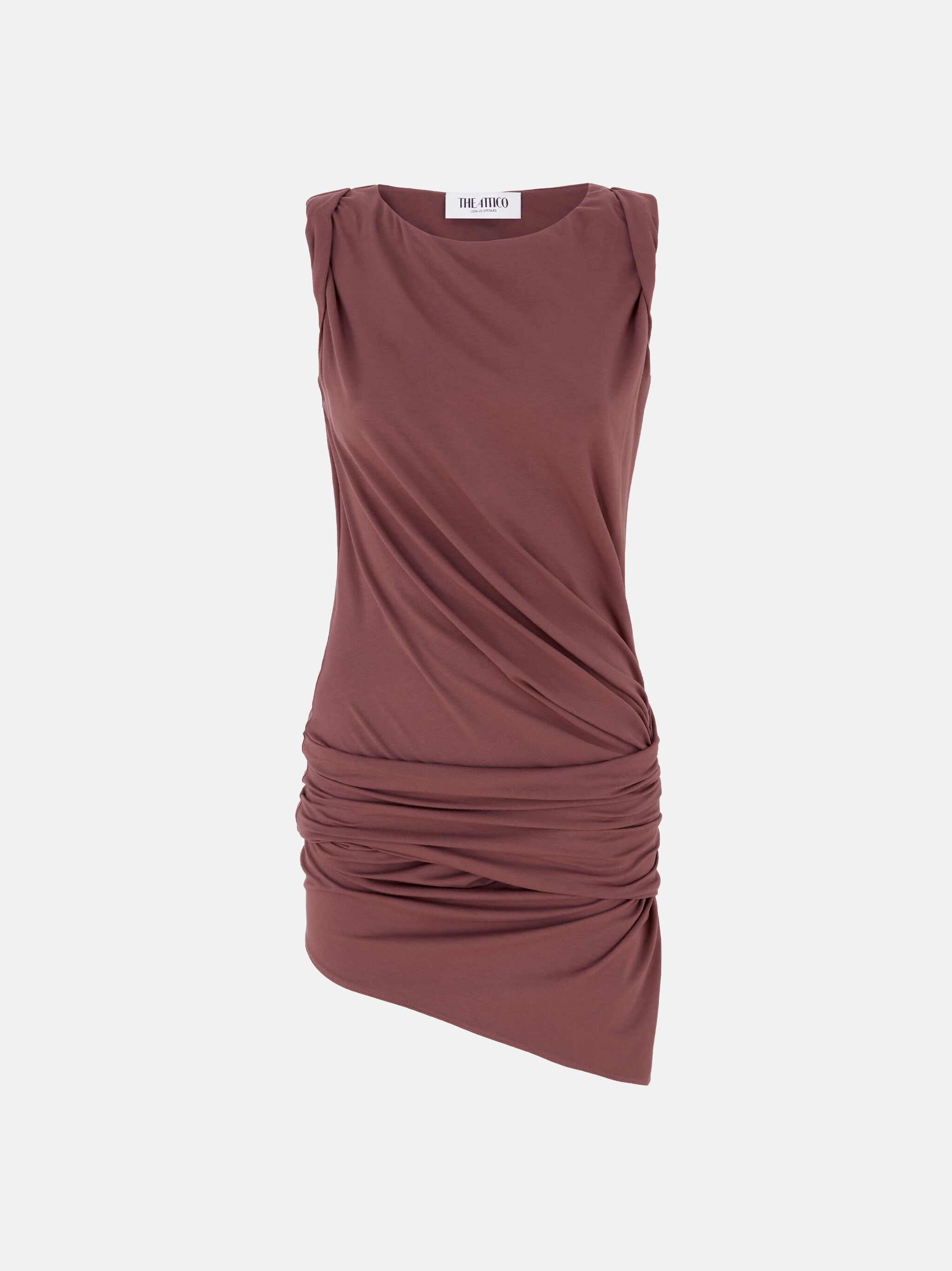 Draped mini dress in dark mauve jersey. Made in Italy. Style 250WCA00396JJJ053AA866 SIZE & FIT The model is wearing a size 40 and her height is 69,6 in, bust 30,7 in, waist 23,2 in, hips 34,6 in - height 177 cm, bust 78 cm, waist 59 cm, hips 88 cm. Regular fit. We recommend taking your true size. DETAILS Main Material: 95% viscose 5% elastane