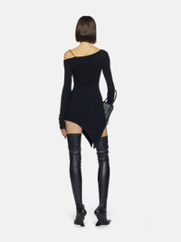 'Desai'' mini dress in black stretch viscose knit with long sleeves, asymmetrical neckline and bottom and logo metal ring. Made in Italy. Style 236WCA237KV001100 SIZE & FIT The model is wearing a size 40 and her height is 70,4 in, bust 30,7 in, waist 21,6 in, hips 34,6 in - height 179 cm, bust 80 cm, waist 60 cm, hips 90 cm. Regular fit. We recommend taking your true size. DETAILS Main fabric: 70% viscose, 30% polyamide
