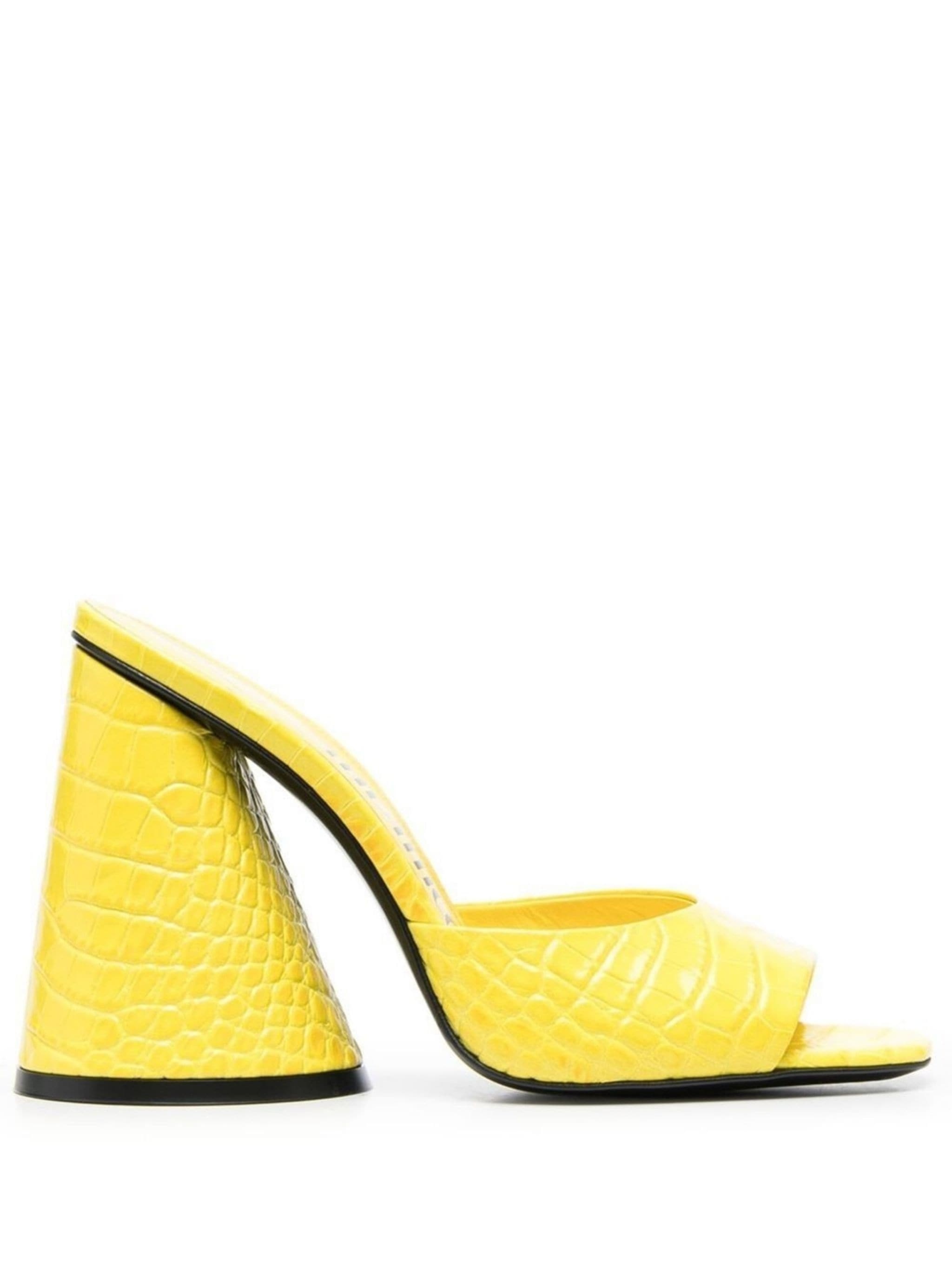 Devon 110mm mules from The Attico featuring yellow, leather, crocodile effect, slip-on style, open toe, high block heel and branded insole. Size & Fit HEEL: 11cm Fabric and Care Designer Style ID: 227WS502EL002 Designer Colour: 044 PALE YELLOW Composition: Sole: Leather 100%; Outer: Leather 100%; Lining: Leather 100% Made in Italy
