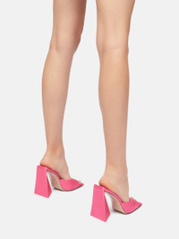 ''Devon'' mule in pink satin with pyramidal heel, height 115mm. Style 237WS000V015026 SIZE & FIT Model wears size 39 DETAILS Main fabric: 100% polyester dyed, insole and lining: 100% goat leather dyed, capra hircus linnaeus farm raised coo: Nigeria, sole: 100% bovine leather bos taurus dyed farm raised coo: France, heel 110mm - style WS000V015026