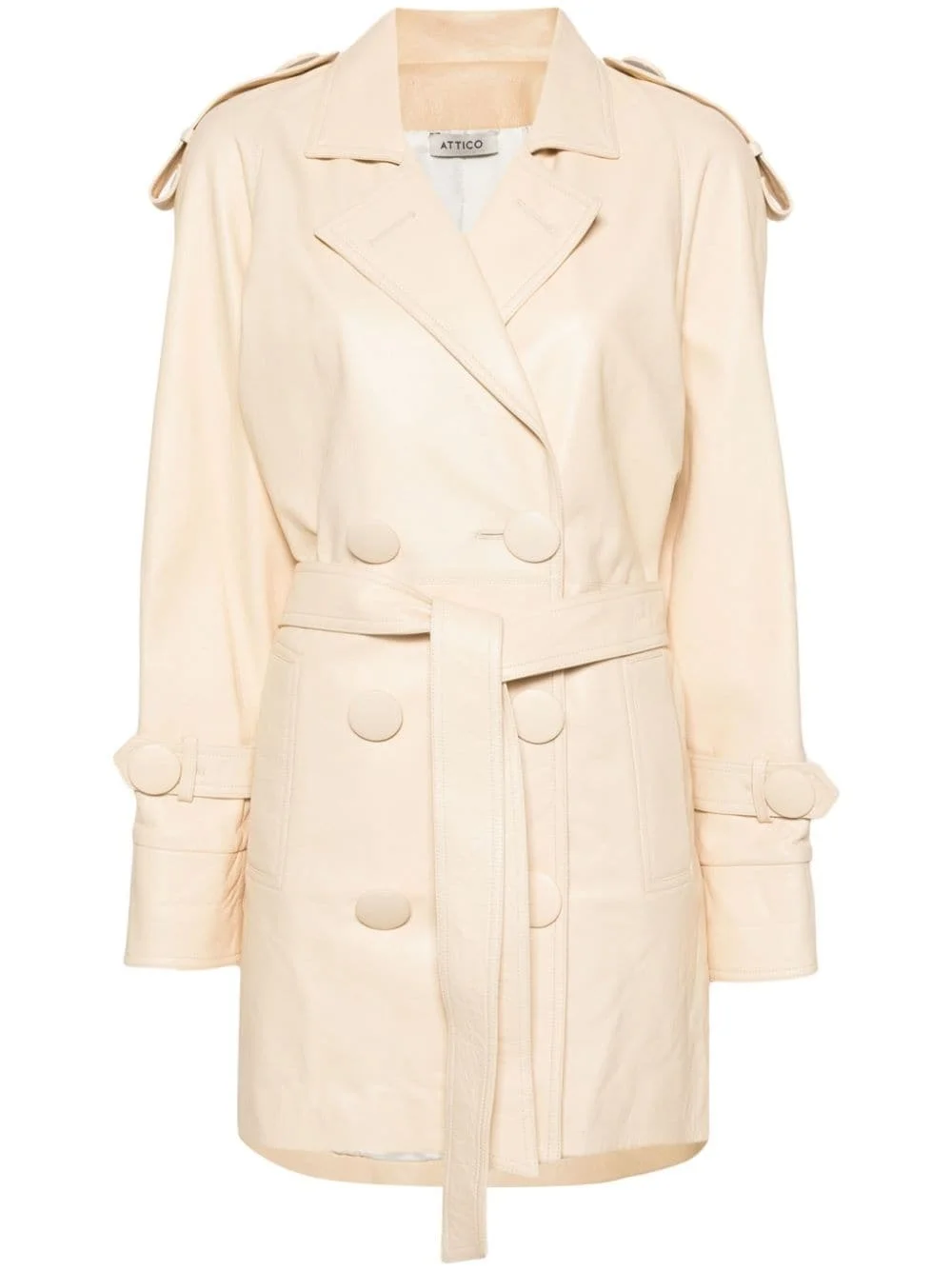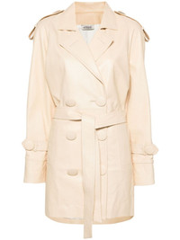 double-breasted leather coat Highlights - Ivory white - Sheepskin - Pebbled texture - Seam detailing - Peak lapels - Epaulettes - Long sleeves with buttoned cuffs - Two side welt pockets - Belt loops - Detachable waist belt - Full lining - Straight hem - Double-breasted button fastening Made in Italy Composition Outer: Sheepskin 100% Lining: Viscose 100% SIZE & FIT Model measurements Height 5 ft 9 in(1.75 m) Bust/Chest 34.64 in(88 cm) Hips 36.61 in(93 cm) Waist 26.37 in(67 cm) FittingInformation Designed to be unstructured, offering a loose fit throughout The tie fastening gives an adaptable and personalised fit Soft leather has a supple and smooth construction offering some flexibility This piece fits true to size – take your usual size