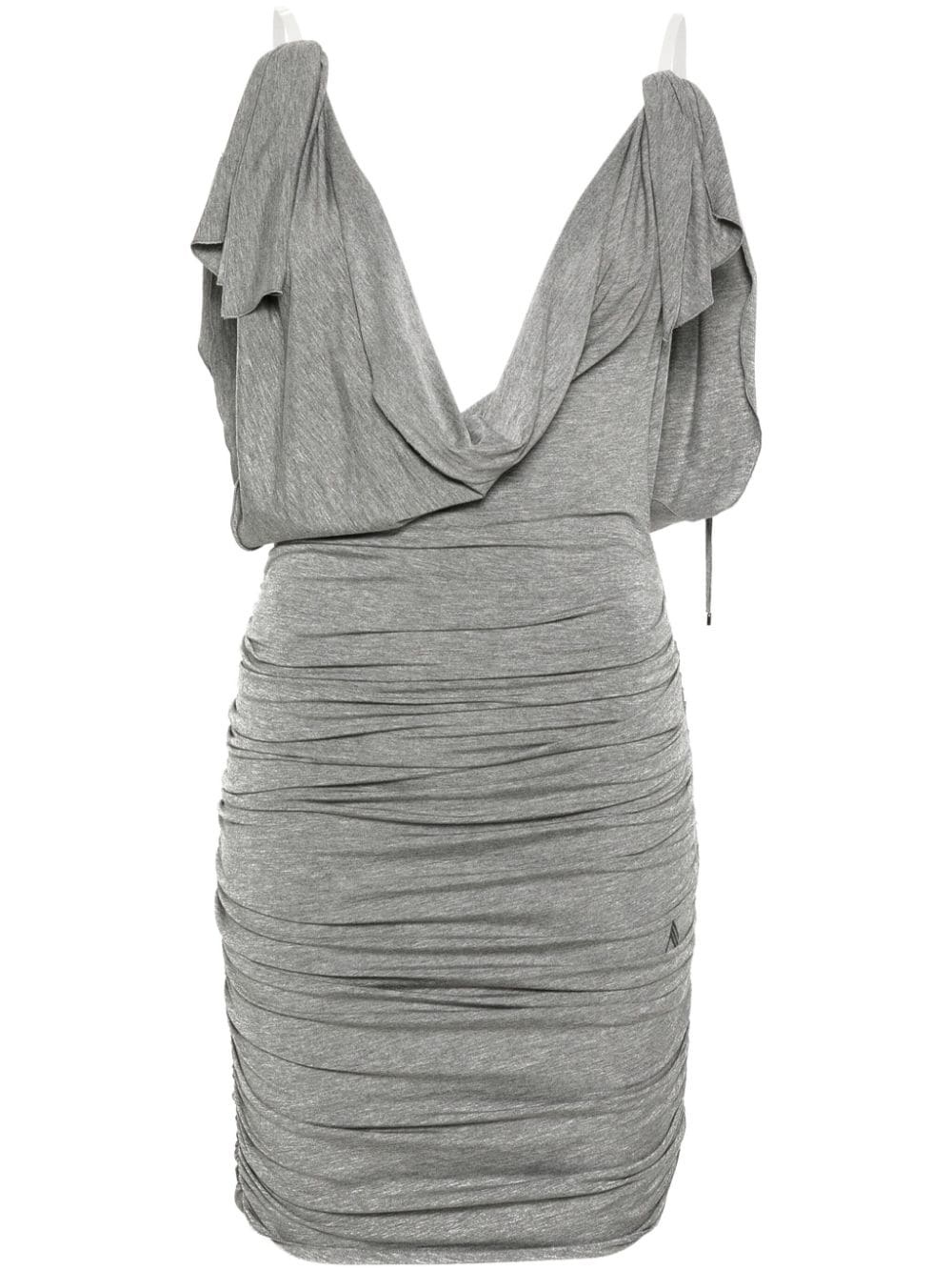 draped mini dress Highlights - Medium grey - Stretch-jersey - Mã©lange effect - Draped design - Asymmetric body - Plunging v-neck - Sleeveless - Scoop back - Straight hem - Thigh-length Made in Italy Composition Viscose 92%, Elastane 8% SIZE & FIT Model measurements Height 5 ft 9 in(1.75 m) Bust/Chest 30.7 in(78 cm) Hips 34.64 in(88 cm) Waist 23.22 in(59 cm) FittingInformation Designed for a loose fit at the chest with a close fit over the waist and hips Made from a midweight stretch fabric, this piece offers elasticity and flexibility when worn This piece fits true to size – take your usual size