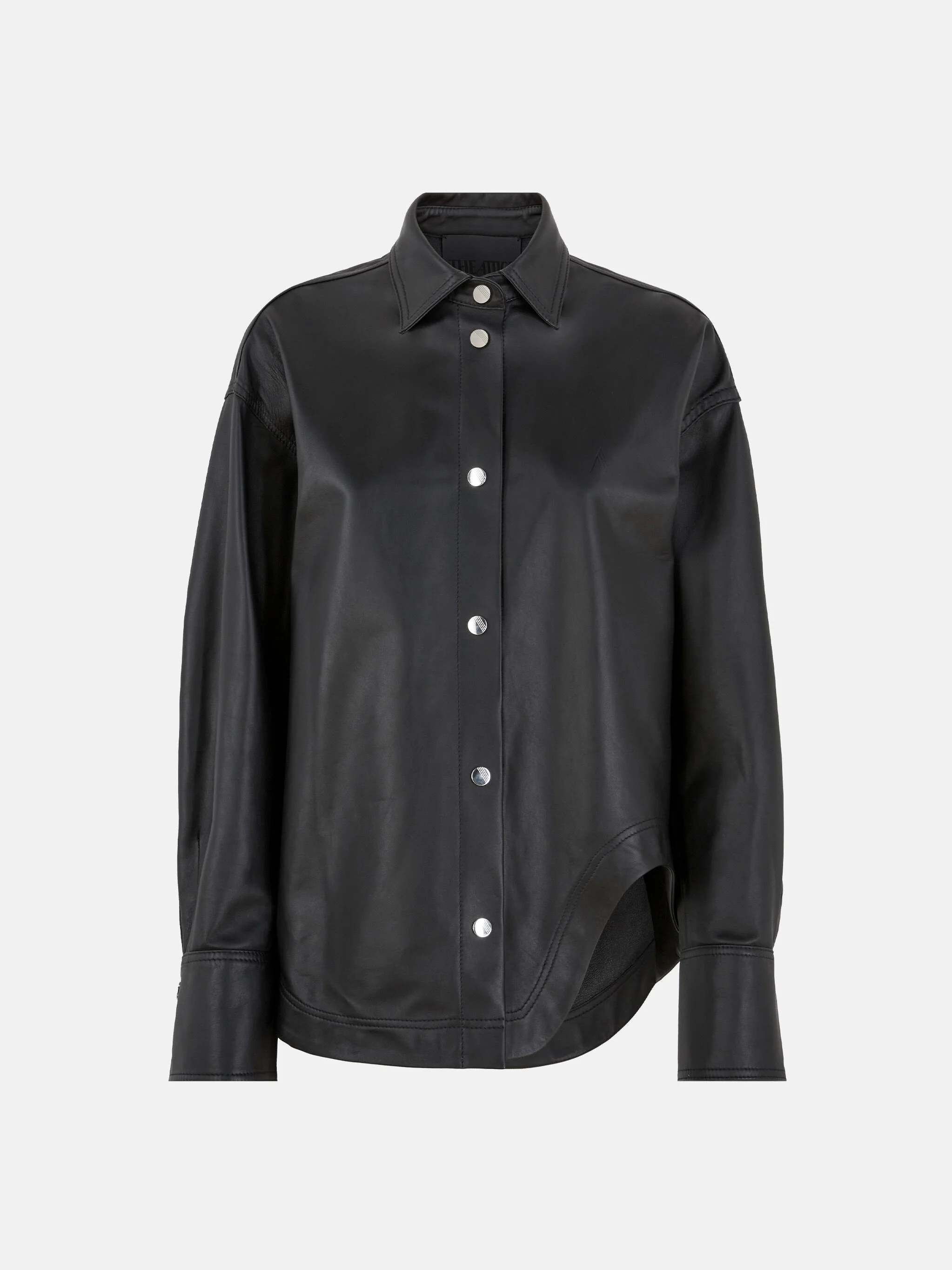 Eliza'' shirt in black soft nappa leather with shaped split. Made in Italy. Style 250WCB00074LBT129AA100 SIZE & FIT The model is wearing a size 40 and her height is 69,6 in, bust 30,7 in, waist 23,2 in, hips 34,6 in - height 177 cm, bust 78 cm, waist 59 cm, hips 88 cm. Regular fit. We recommend taking your true size. DETAILS Main Material: 100% Lamb Leather Ovis Aries Aries, farm raised,coo: Tunisia