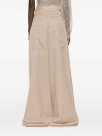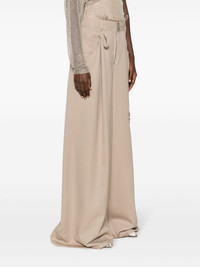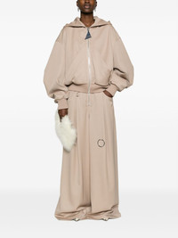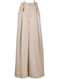 embellished wide-leg wool trousers The re-worked basics of these beige twill trousers are a recurring element seen across The Attico’s collection of bottoms – one belt loop cascades into an O ring-embellished strap while others extend into additional hoops. They’re crafted to an exaggerated wide-leg silhouette that pools at the floor and detailed with a pintucked coin pocket that resembles the brand logo. Highlights - Beige - Virgin wool - Twill weave - Tonal stitching - Pleat detailing - Pintuck detailing - Strap detailing - Ring embellishment - Branded zip puller - Short front zip fastening - Belt loops - High-waisted - Wide leg - Classic five pockets - Straight hem Made in Italy Composition Outer: Virgin Wool 100% Lining: Viscose 100% SIZE & FIT Model measurements Height 5 ft 11 in(1.8 m) Bust/Chest 32.67 in(83 cm) Hips 36.22 in(92 cm) Waist 24.4 in(62 cm) FittingInformation Designed with a wide-leg cut, these trousers allow for a close fit at the waist and offer a loose and roomy fit over the leg Particularly long in length; consider your own measurements Made from a midweight non-stretch fabric This piece fits true to size – take your usual size Washing instructions Dry Clean Only