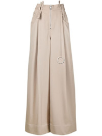beige virgin wool twill weave tonal stitching pleat detailing pintuck detailing strap detailing ring embellishment branded zip puller short front zip fastening belt loops high-waisted wide leg classic five pockets straight hem Size & Fit Model Measurements: Bust: 83cm Height: 181cm Hips: 90cm Waist: 60cm