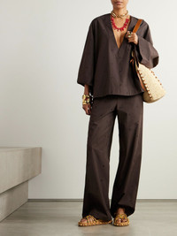 A closer look reveals The Attico's blouse is dotted all over with tonal embroidered logos. It's made from crisp cotton-blend poplin for a roomy fit and has a deep V-neckline. Complete the set with the matching pants. Size & Fit - Fits true to size, take your normal size - Designed for a loose fit - Mid-weight, non-stretchy fabric - Model is 180cm/ 5'11" and is wearing an IT 40 Model measurements: - Bust: 85cm/ 33.5" - Waist: 62cm/ 24.5" - Hip: 88cm/ 34.5" Details & Care - Brown cotton-blend poplin - Slips on - 90% cotton, 10% polyester - Hand wash