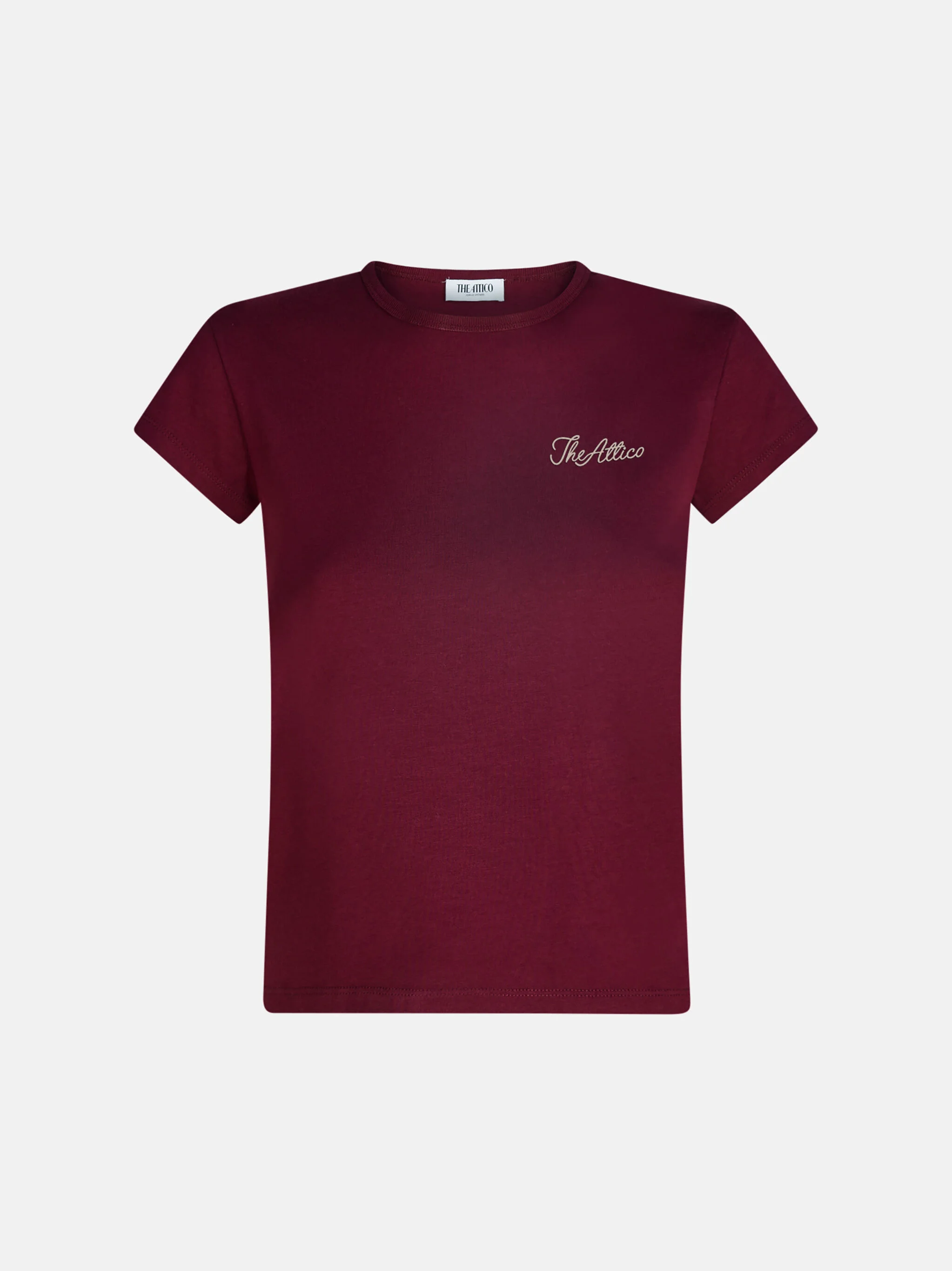 T-shirt in burgundy light jersey. Made in Portugal. Style 251WCT00357JJJ025AA114 SIZE & FIT The model is wearing a size 40 and her height is 70 in, bust 31,1 in, waist 24 in, hips 34,6 in - height 178 cm, bust 79 cm, waist 61 cm, hips 88 cm. Regular fit. We recommend taking your true size. DETAILS Main material: 100% cotton, second material: 100% cotton