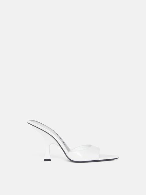 ''Ester'' sandal in white metallic patent with lacquered heel, height 95mm. Made in Italy. Style 247WS789E101760 SIZE & FIT Model wears size 39. DETAILS Main fabric: 70% polyurethane, 30% polyester, insole and lining: 100% sheep leather, ovis aries farm raised coo: Nigeria, sole: 100% bovine leather dyed, bos taurus farm raised coo: Western Europe. Heel 95mm.