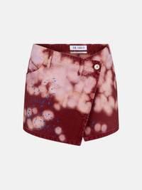 ''Eudra'' asymmetrical mini skirt in pink and bordeaux tie-dye denim with splashed blue paint, high-rise waist and folded fifth pocket. Style 232WCS123D050449 SIZE & FIT The model is wearing a size 40 and her height is 179 cm, bust 80 cm, waist 60 cm, hips 90 cm. Fitted style. We recommend taking one size larger. DETAILS Main fabric: 100% cotton, lining: 100% cotton