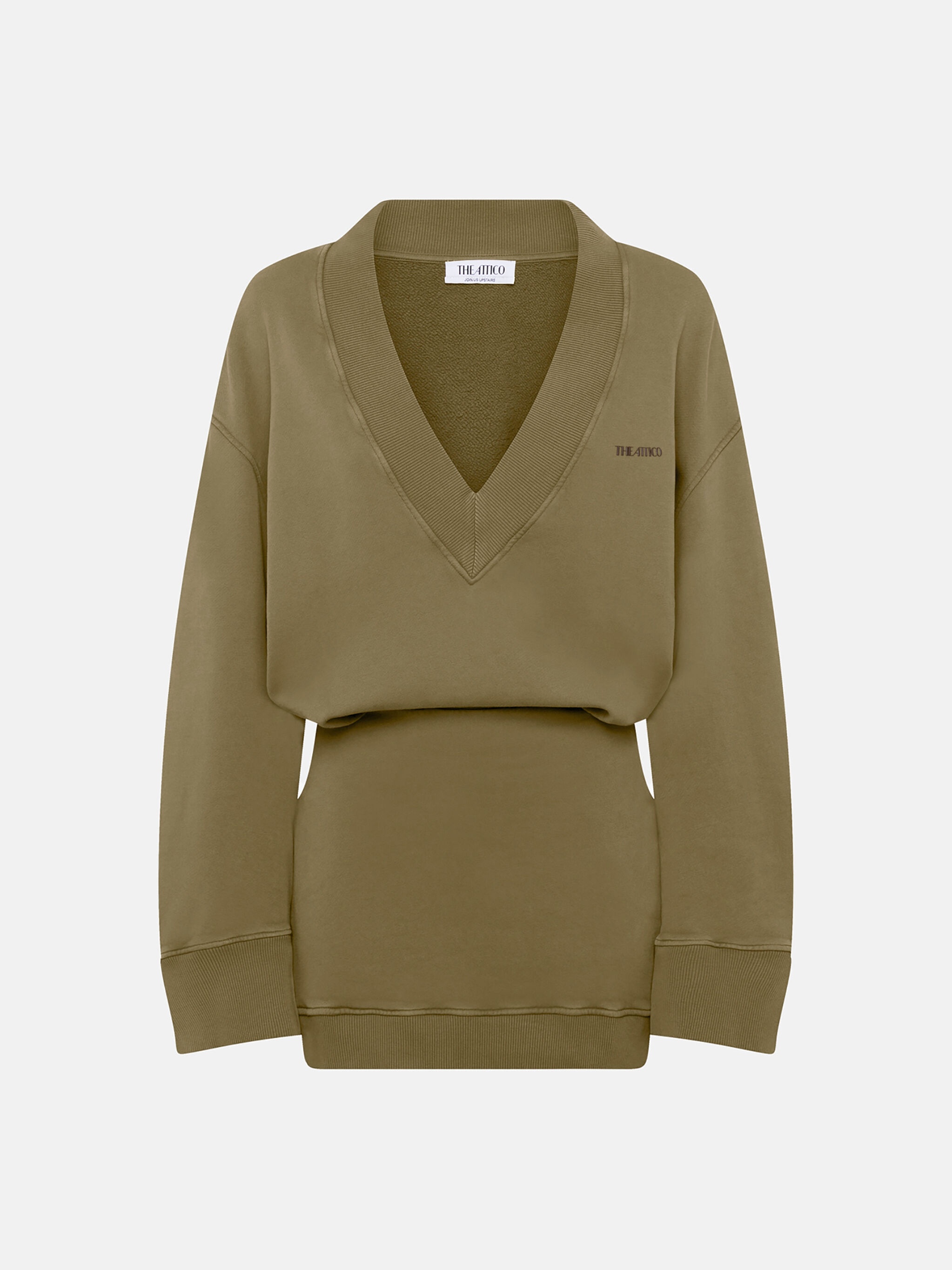 Mini dress in faded green melange brushed fleece with deep V neckline and color matching rubber label. Made in Portugal. Style 247WCA320JF03722 SIZE & FIT The model is wearing a size 40 and her height is 69,6 in, bust 30,7 in, waist 23,2 in, hips 34,6 in - height 177 cm, bust 78 cm, waist 59 cm, hips 88 cm. Regular fit. We recommend taking your true size. DETAILS Main fabric: 100% cotton, second material: 95% cotton 5% elastane