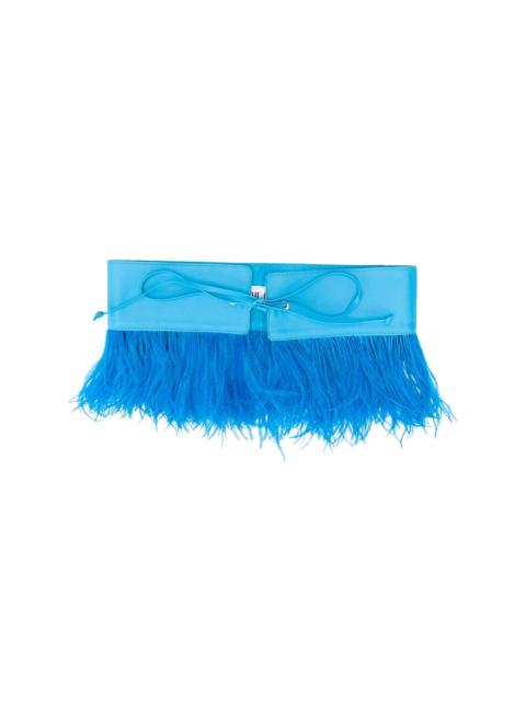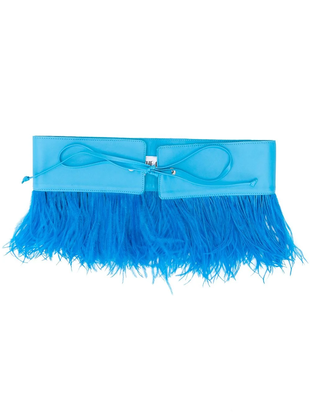 feather embellished belt Turquoise blue lambskin and ostrich feather embellished belt from The Attico featuring a tie fastening. Imported Composition Lamb Skin 100%, Ostrich Feather 100% SIZE & FIT Measurement TOTAL LENGTH 27.55 in(70 cm) WIDTH 6.69 in(17 cm)