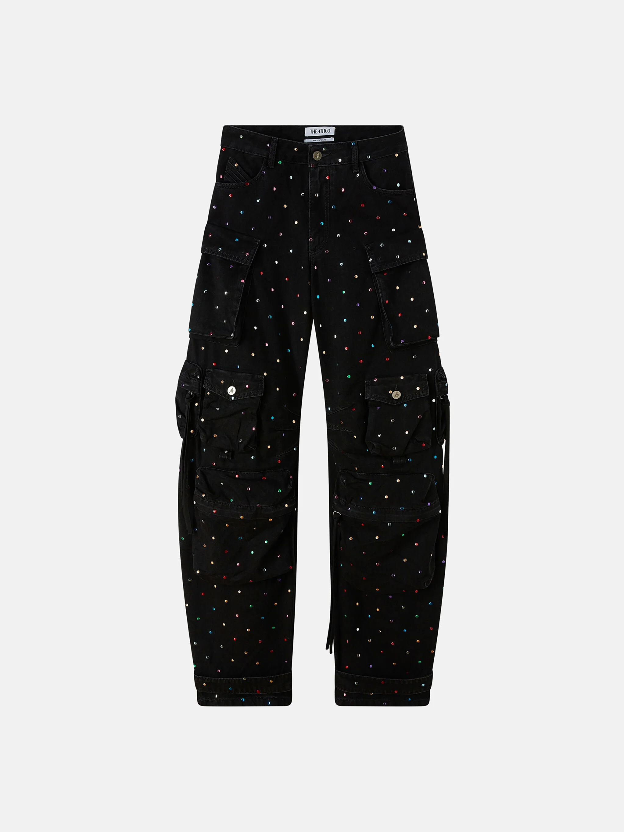 ''Fern'' long pants in black denim termostrass hotfixed studs with multi-pockets, folded fifth pocket and embroidered logo. Made in Italy. Style 247WCP84D075S100 SIZE & FIT The model is wearing a size 26 and her height is 69,6 in, bust 30,7 in, waist 23,2 in, hips 34,6 in - height 177 cm, bust 78 cm, waist 59 cm, hips 88 cm. Relaxed, oversized fit. We recommend taking one size smaller. DETAILS Main fabric: 68% rayon 27% polyamide 5% elastane