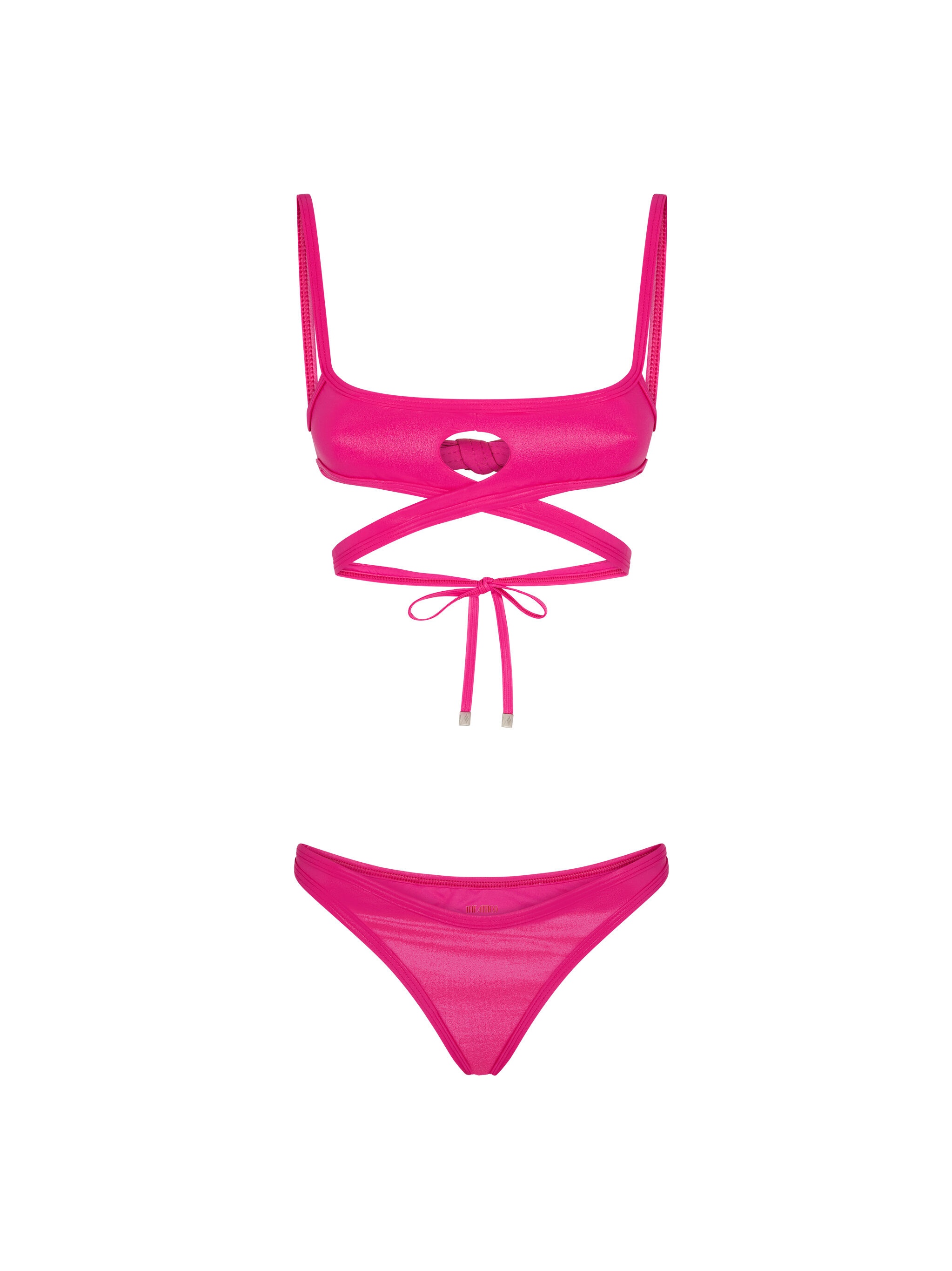 Bikini in fuchsia wet lycra with crossed bra and metallic logo ends. Style 233WBB67PA36008 SIZE & FIT The model is wearing a size S and her height is 181 cm, bust 83 cm, waist 62 cm, hips 89 cm. Regular fit. We recommend taking your true size. DETAILS Main fabric: 82% polyamid 18% elastane, lining: 84% polyamid 16% elastane